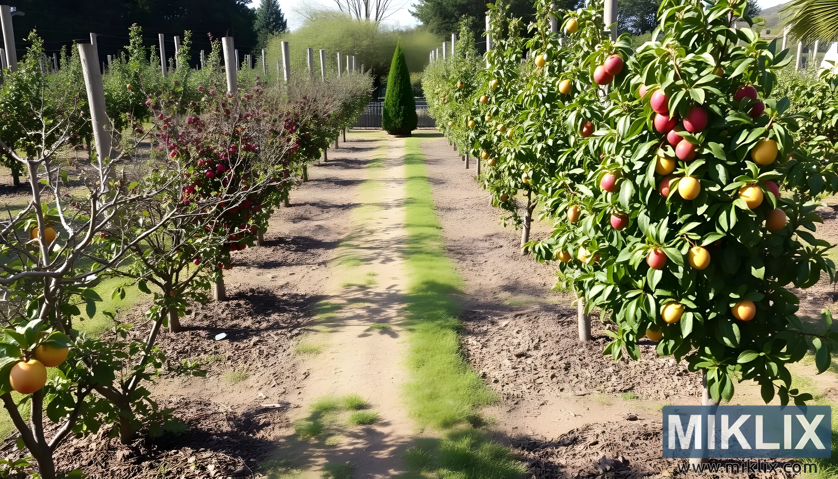 A well-organized orchard with rows of fruit trees bearing yellow and red fruits, bordered by green grass and a central dirt path, showing abundance.