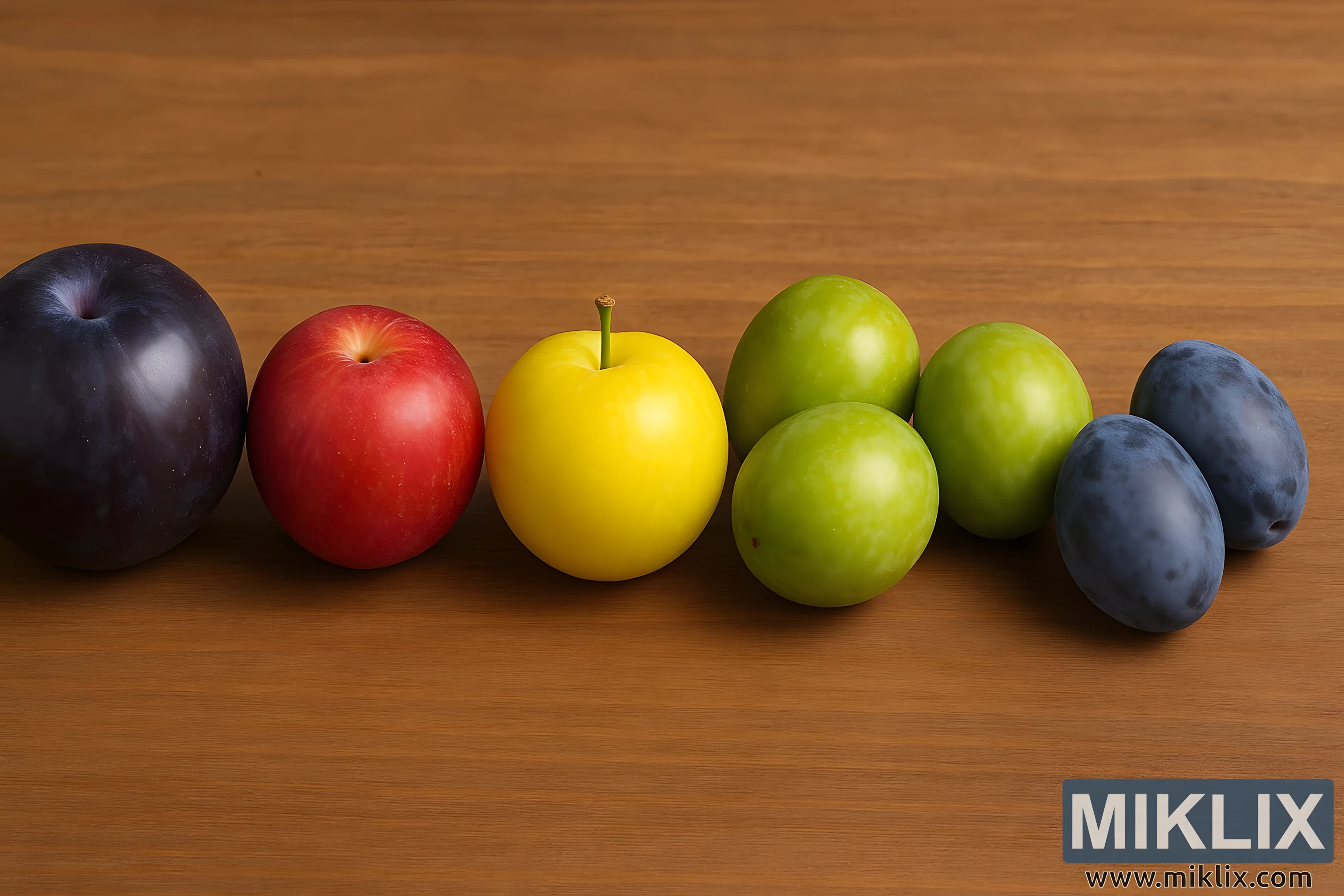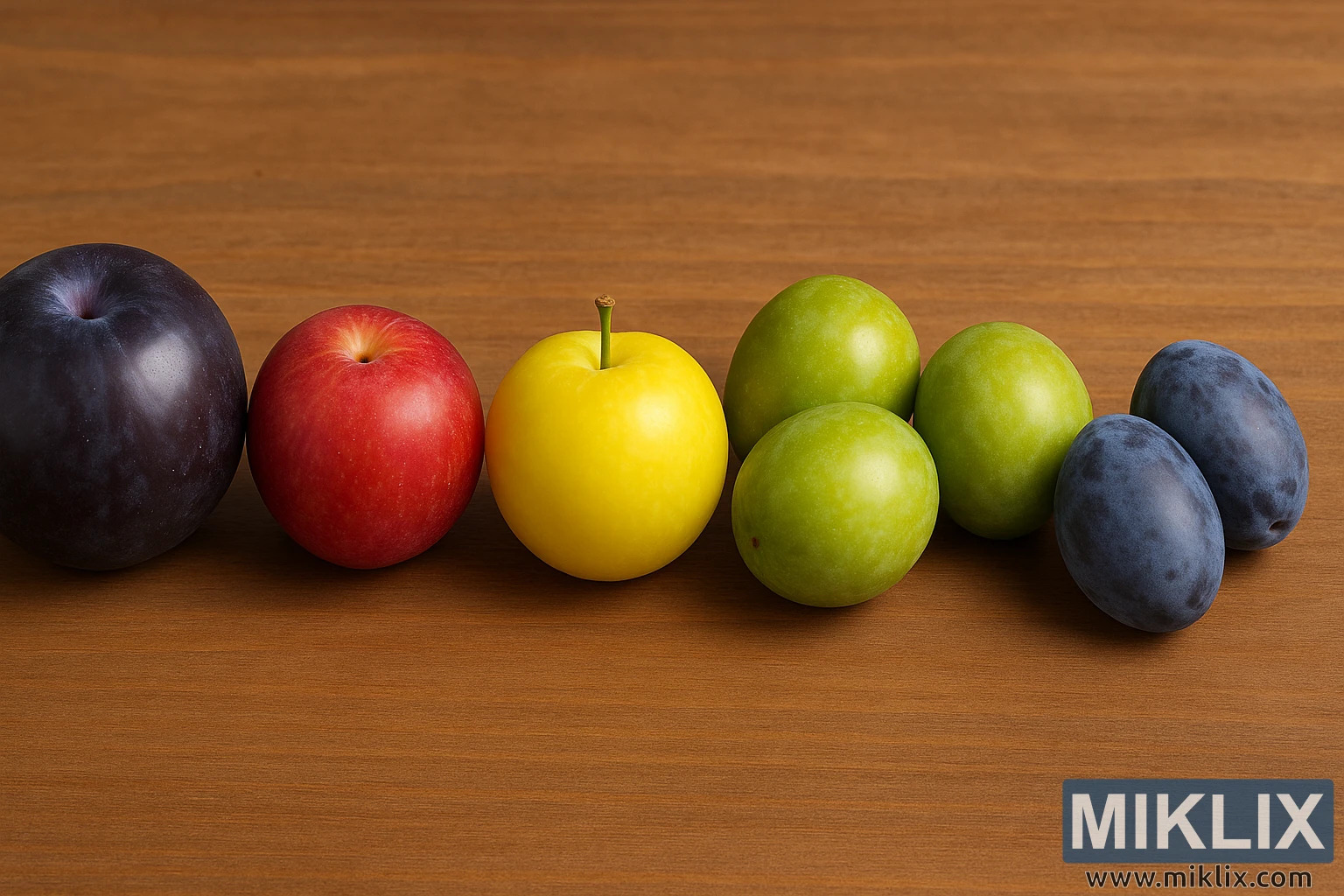 A vivid photo showing seven plum varieties of different colors and sizes neatly arranged on a warm-toned wooden surface.