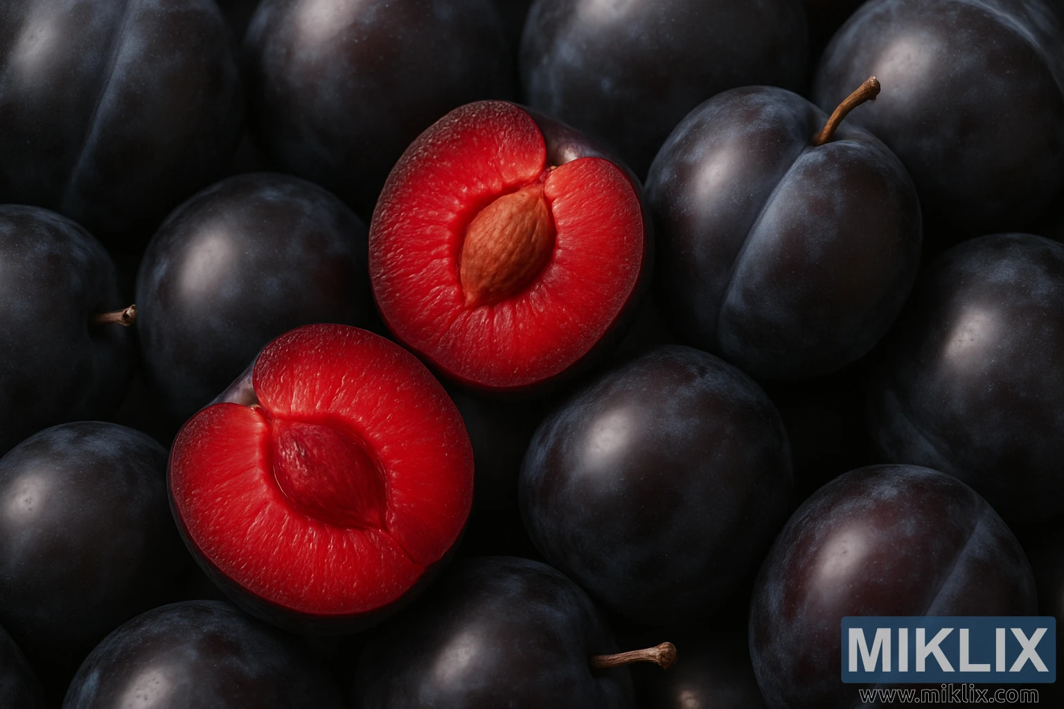 A striking close-up of ripe Satsuma plums with dark purple skins and two halves revealing vivid ruby-red flesh and a tan pit.