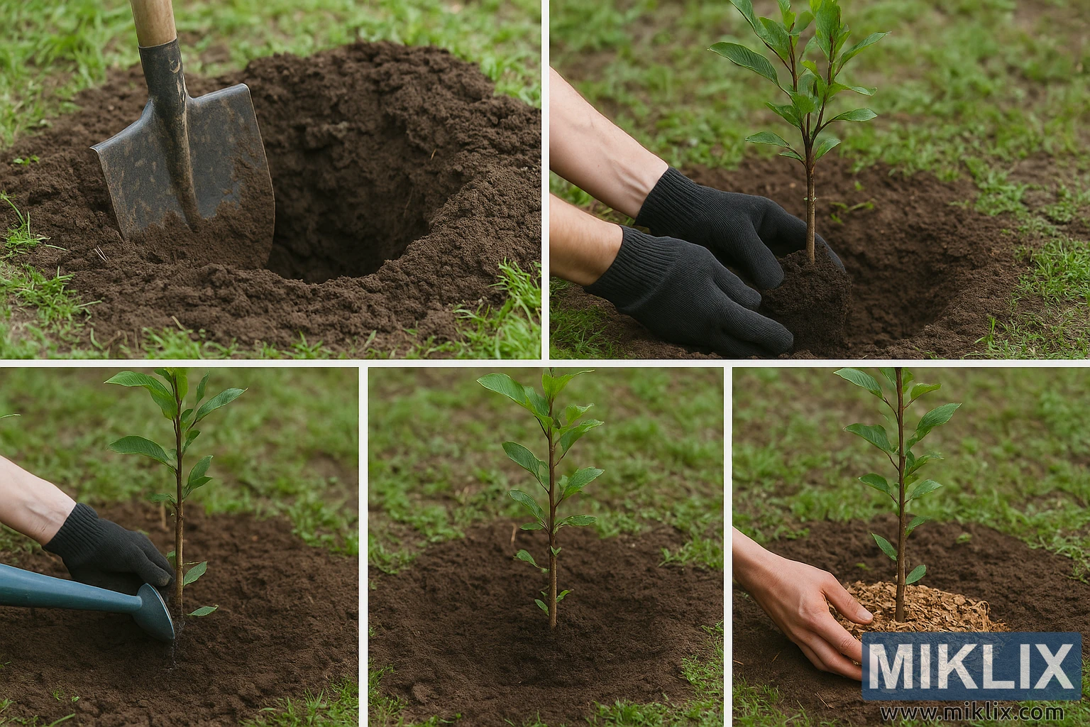 The center bottom panel shows the sapling standing upright after planting, its stem straight and supported by the firm soil, now evenly mounded around the base to direct water toward the roots.
