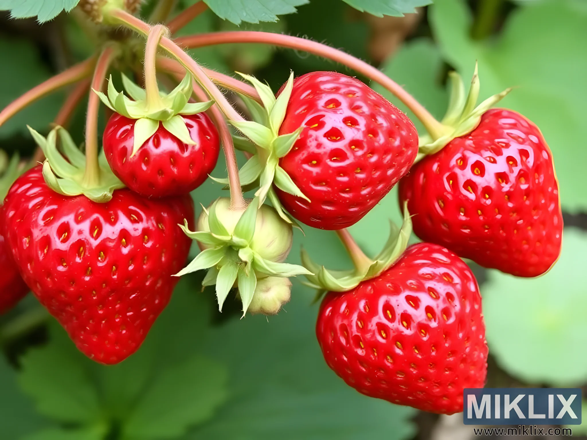 In this intimate close-up of a thriving strawberry plant, nature’s precision and beauty are captured in exquisite detail. A cluster of strawberries hangs gracefully from slender, slightly arched stems, each fruit suspended like a jewel in a verdant setting. The ripe strawberries are a brilliant, saturated red, their glossy surfaces gleaming under the soft light, suggesting they are at the very peak of ripeness. Their plump forms are full and rounded, with a subtle taper toward the tip that gives them their iconic conical shape. Scattered across their skin are tiny, golden seeds—achenes—that add texture and visual interest, while also serving as a reminder of the fruit’s botanical complexity.