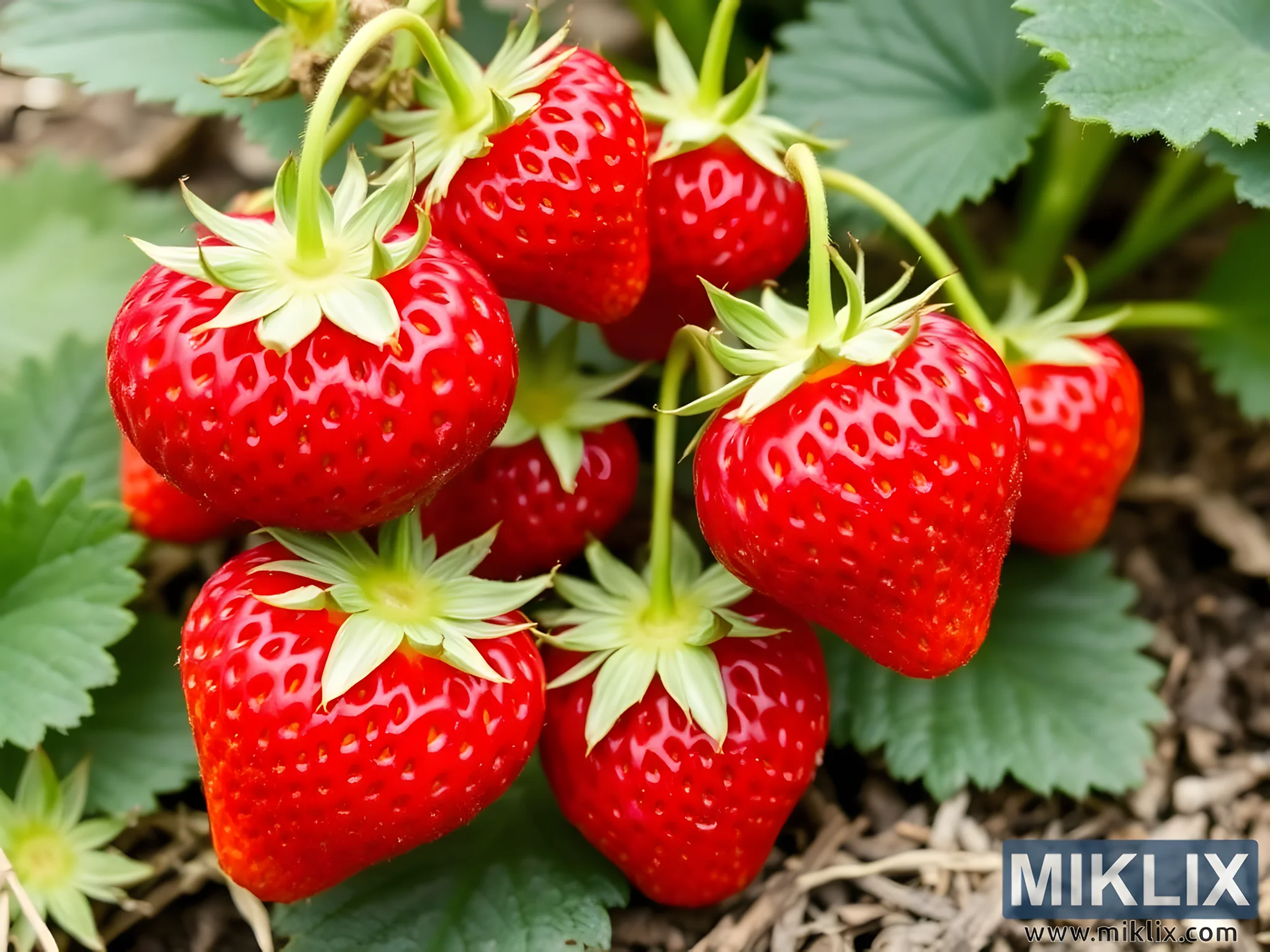In this vivid close-up of a flourishing strawberry plant, nature’s bounty is captured in a moment of peak ripeness and vitality. A cluster of strawberries hangs gracefully from slender green stems, each fruit a radiant beacon of freshness. Their surfaces are smooth and glossy, reflecting the sunlight in a way that accentuates their plumpness and rich red hue. The strawberries are perfectly formed, tapering gently to a rounded tip, and adorned with a delicate scattering of tiny golden seeds that add texture and visual intrigue. These seeds, embedded in the skin, glint subtly in the light, hinting at the intricate biological design that underpins the fruit’s development.