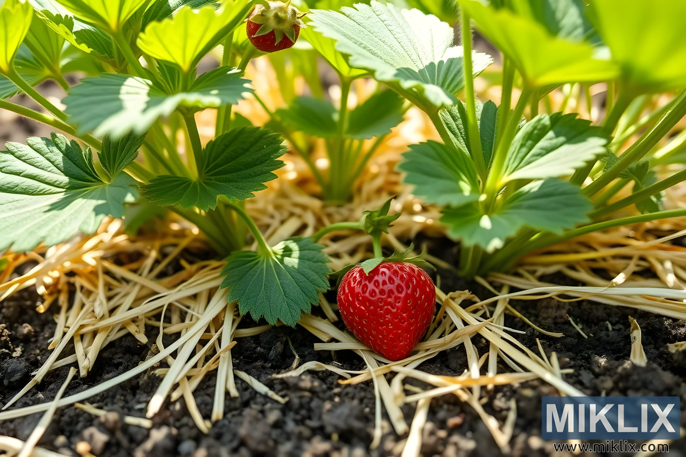 In this intimate garden scene, a strawberry plant emerges from the soil with quiet elegance, its vibrant foliage and ripening fruit bathed in the soft warmth of natural sunlight. The close-up perspective draws the viewer into the heart of the plant’s microcosm, where every detail—from the texture of the soil to the sheen on the fruit—tells a story of attentive care and seasonal abundance. At the center of the composition lies a single ripe strawberry, its bright red skin gleaming against the golden straw mulch that cushions it. The berry is plump and perfectly formed, its surface dotted with tiny golden seeds that catch the light and add a delicate texture to its glossy exterior. The contrast between the strawberry’s vivid hue and the muted tones of the mulch and soil beneath it creates a striking visual harmony, emphasizing the fruit’s ripeness and readiness for harvest.