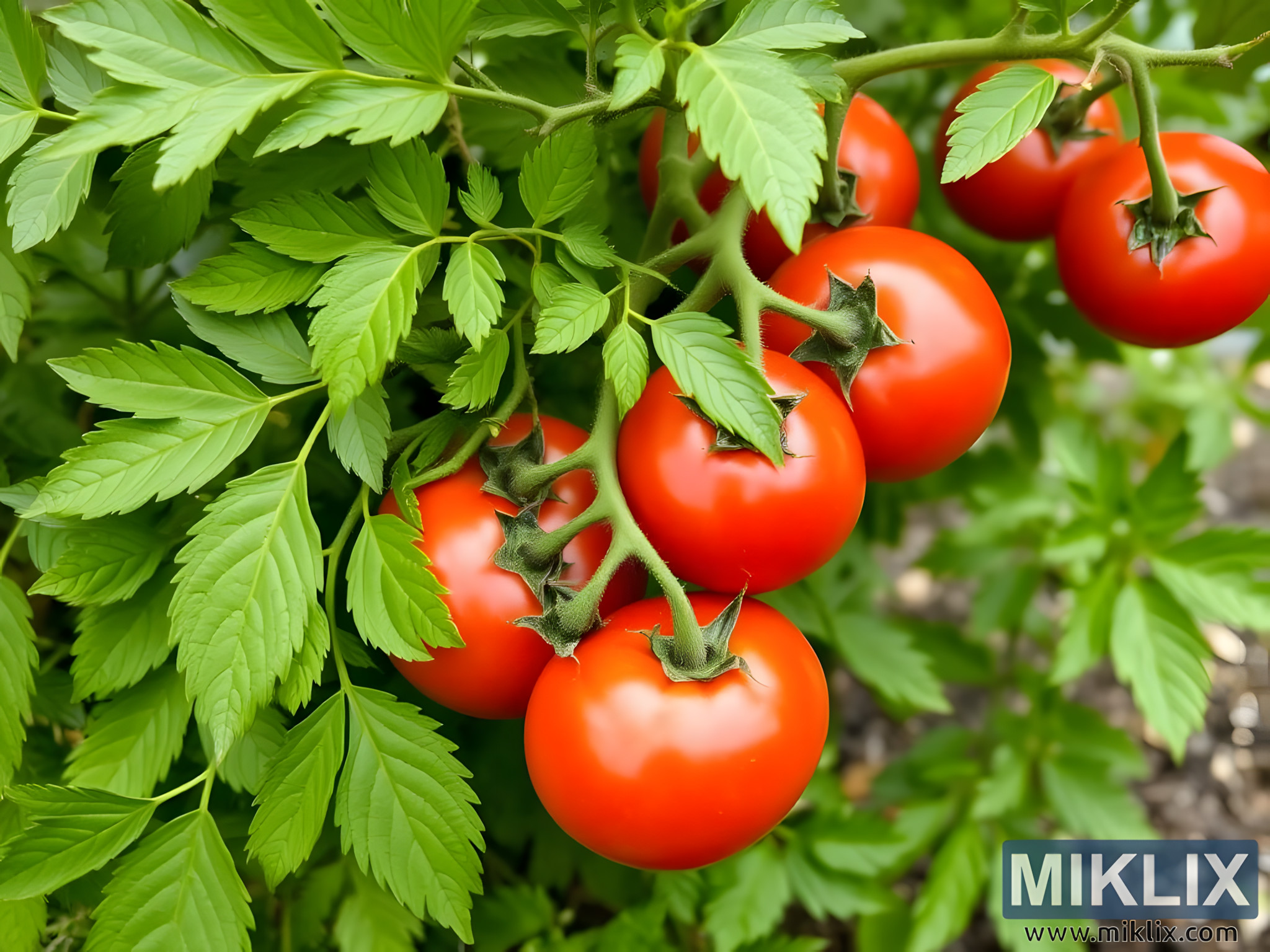 A thriving tomato plant with glossy red tomatoes and lush green leaves, set in a garden, showcasing natural abundance and harvest readiness.