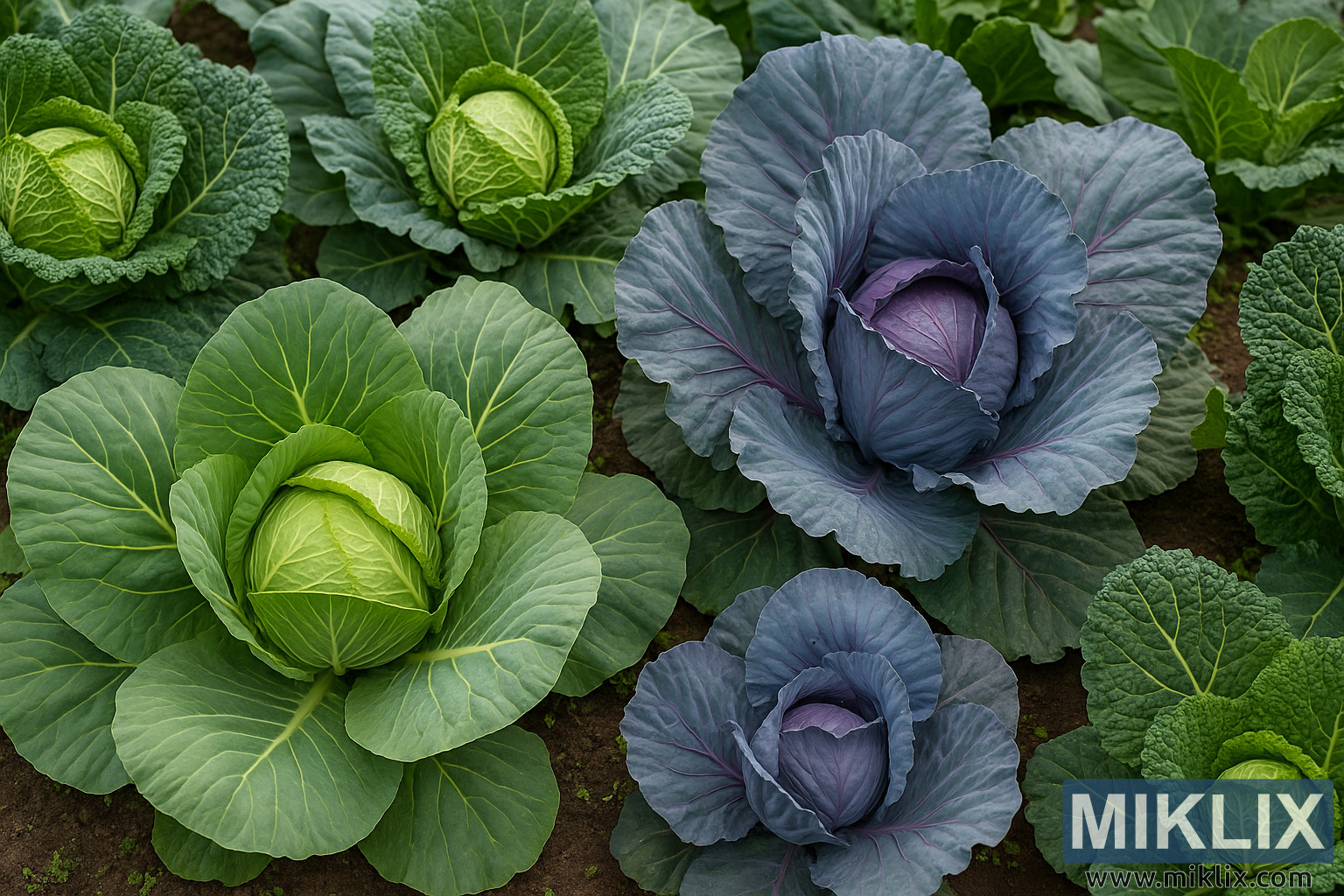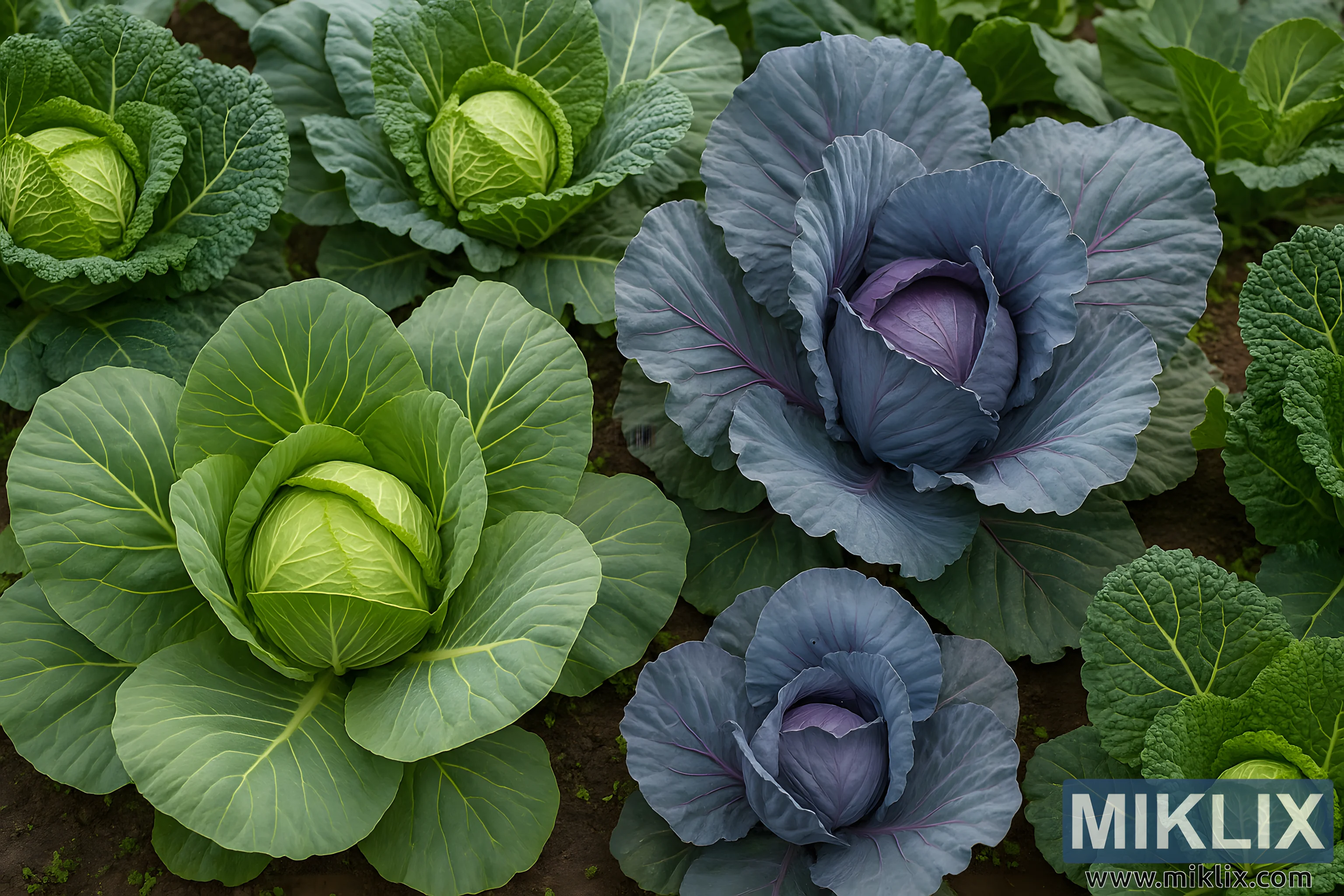High-resolution photo of a garden featuring green, red, and Savoy cabbage varieties, showcasing vibrant textures and rich natural colors.