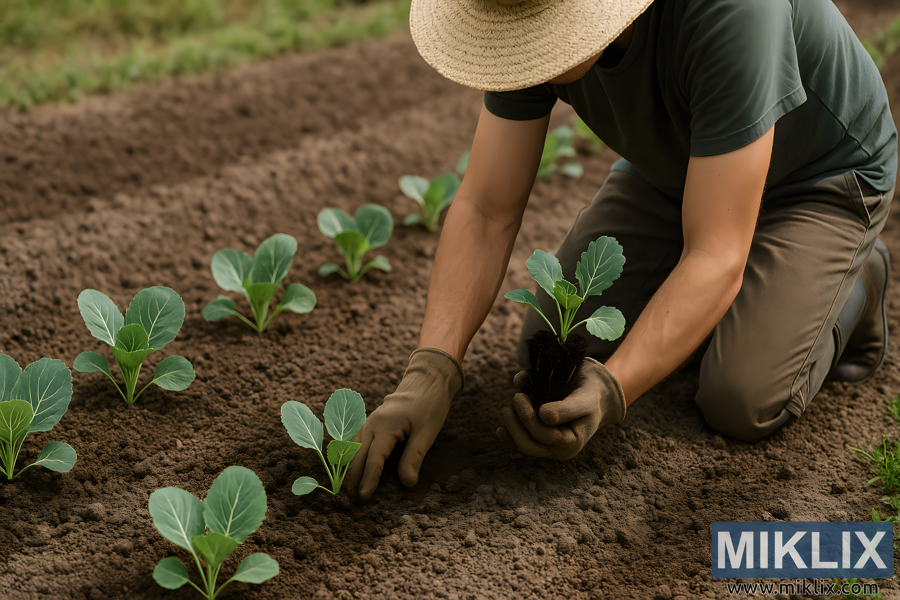 A gardener kneels to plant cabbage seedlings in evenly spaced rows, tending healthy young plants in a well-prepared garden bed.