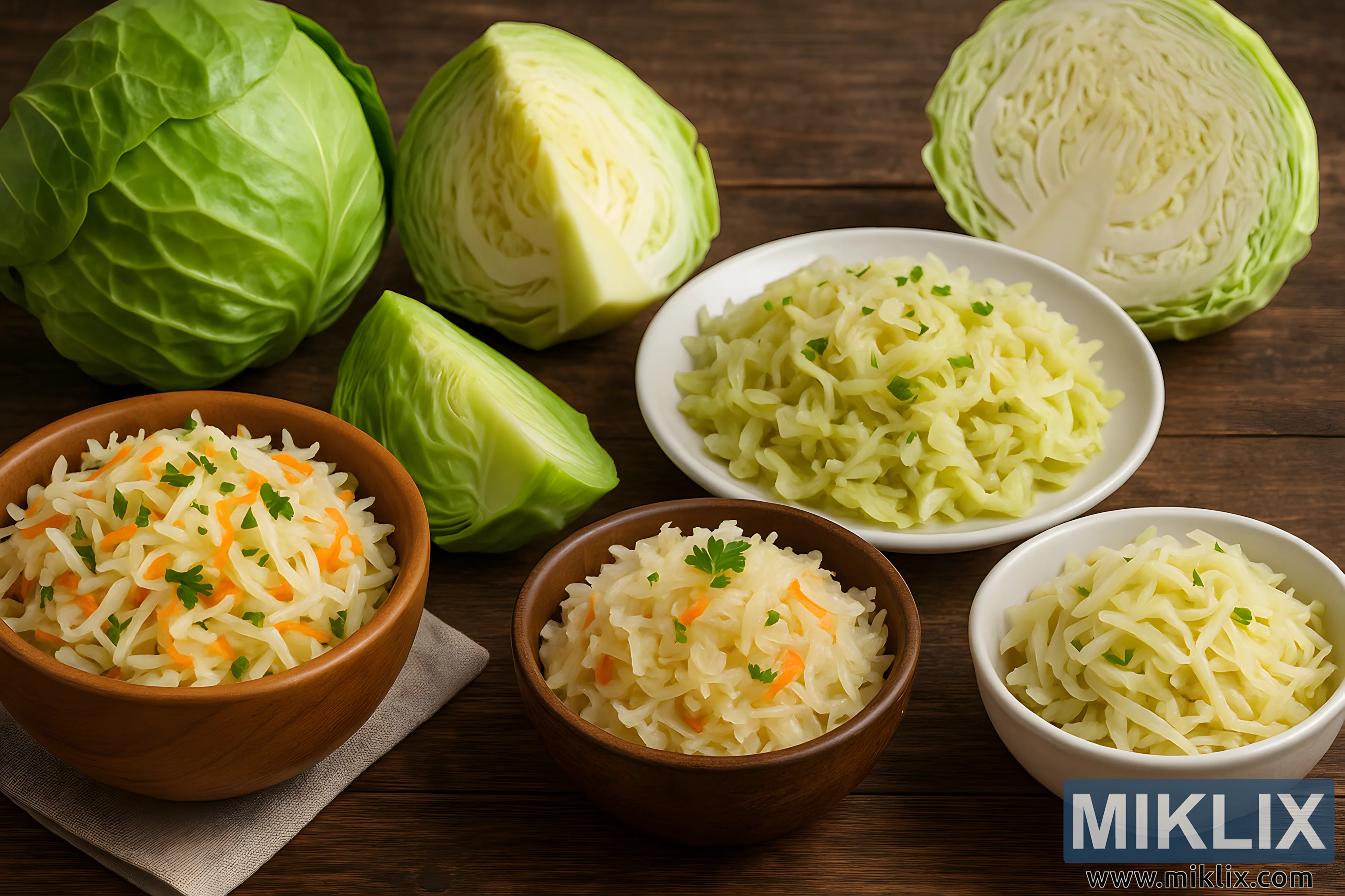 The image presents a richly detailed, high-resolution photograph featuring an assortment of dishes made from fresh green cabbage, arranged artfully on a rustic wooden table. At the forefront, several bowls of shredded cabbage preparations sit neatly aligned, each offering a distinct interpretation of classic cabbage dishes such as coleslaw and sauerkraut. The bowl on the left contains a vibrant mixture of finely shredded cabbage and thin carrot strips, lightly garnished with fresh parsley, giving the dish a lively contrast of color. Adjacent to it, another wooden bowl holds a creamier, slightly softer-looking cabbage blend—perhaps a mild, lightly fermented version of sauerkraut—also topped with a touch of parsley for brightness. To the right, a smooth white ceramic bowl contains a paler, simpler cabbage preparation in long, thin shreds, maintaining a clean and minimalist aesthetic.