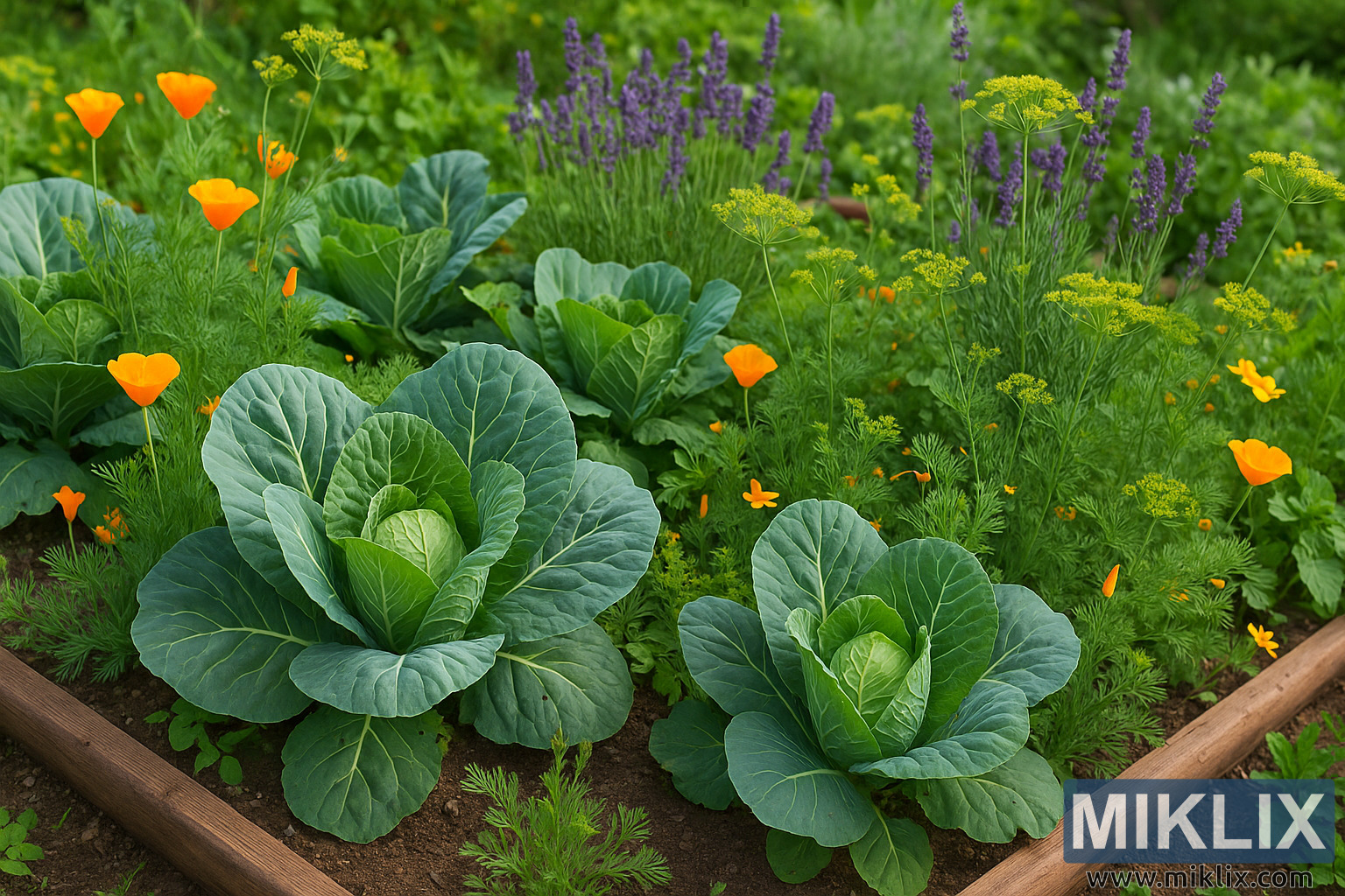 A vibrant raised garden bed featuring healthy cabbage plants growing alongside colorful and beneficial companion flowers such as poppies, dill, and lavender.