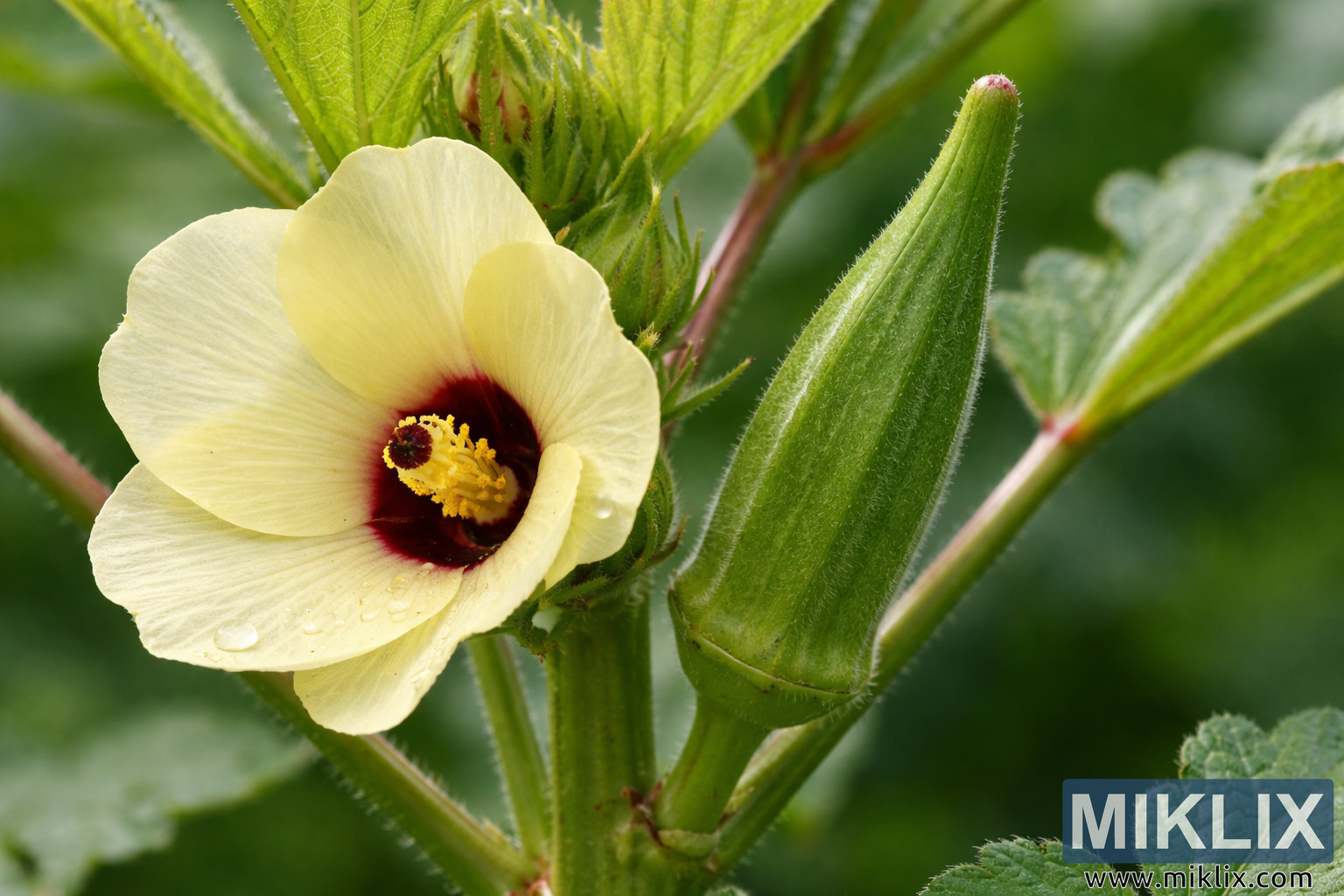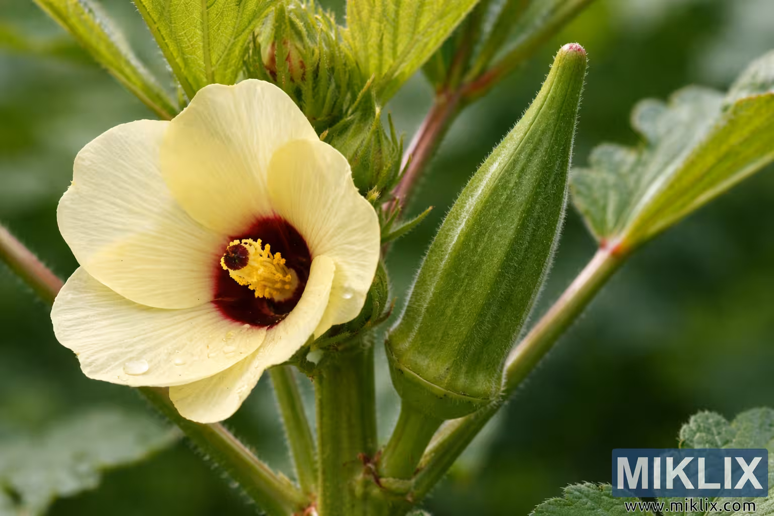 This detailed close-up image captures a vibrant okra plant at an early stage of fruit development, highlighting both the plant’s delicate flower and the emerging green pod. Positioned prominently in the foreground, the okra flower displays broad, soft petals in a pale buttery yellow tone. At the center of the blossom, a deep burgundy-red ring surrounds the reproductive structures, creating a striking contrast with the light petals. Rising from the center is a bright yellow pistil covered with fine pollen, surrounded by tiny stamens that add texture and depth to the flower’s core.