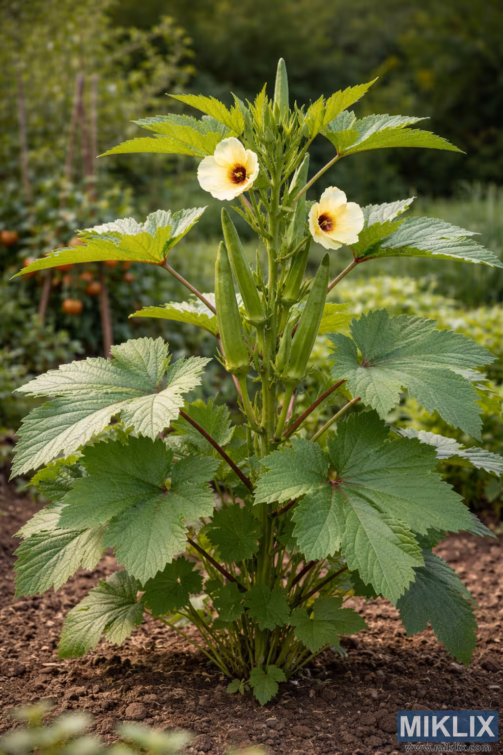 Image: Full Okra Plant Showing Growth Structure, Leaves, Flowers, and Pods
