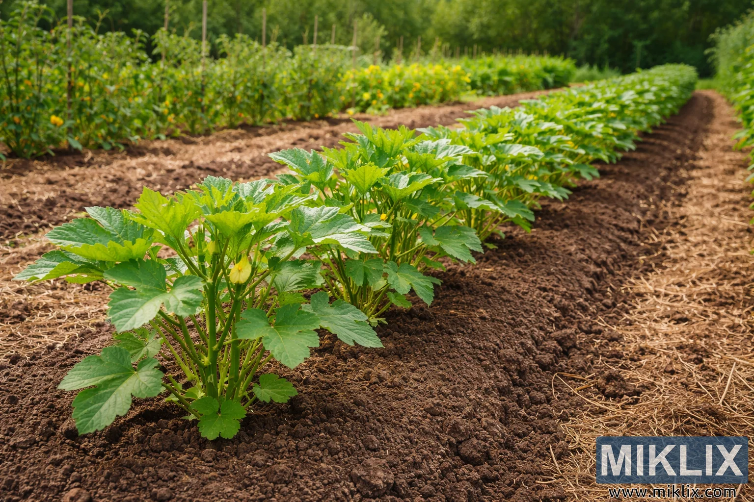 High-resolution garden photo showing healthy okra plants spaced evenly along a raised soil row, surrounded by thriving vegetable beds in bright natural light.