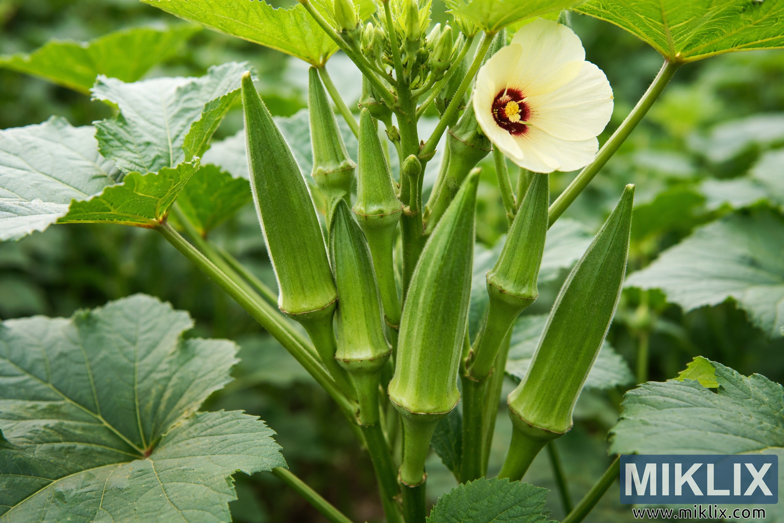 Image: Clemson Spineless Okra Pods and Flower in Garden