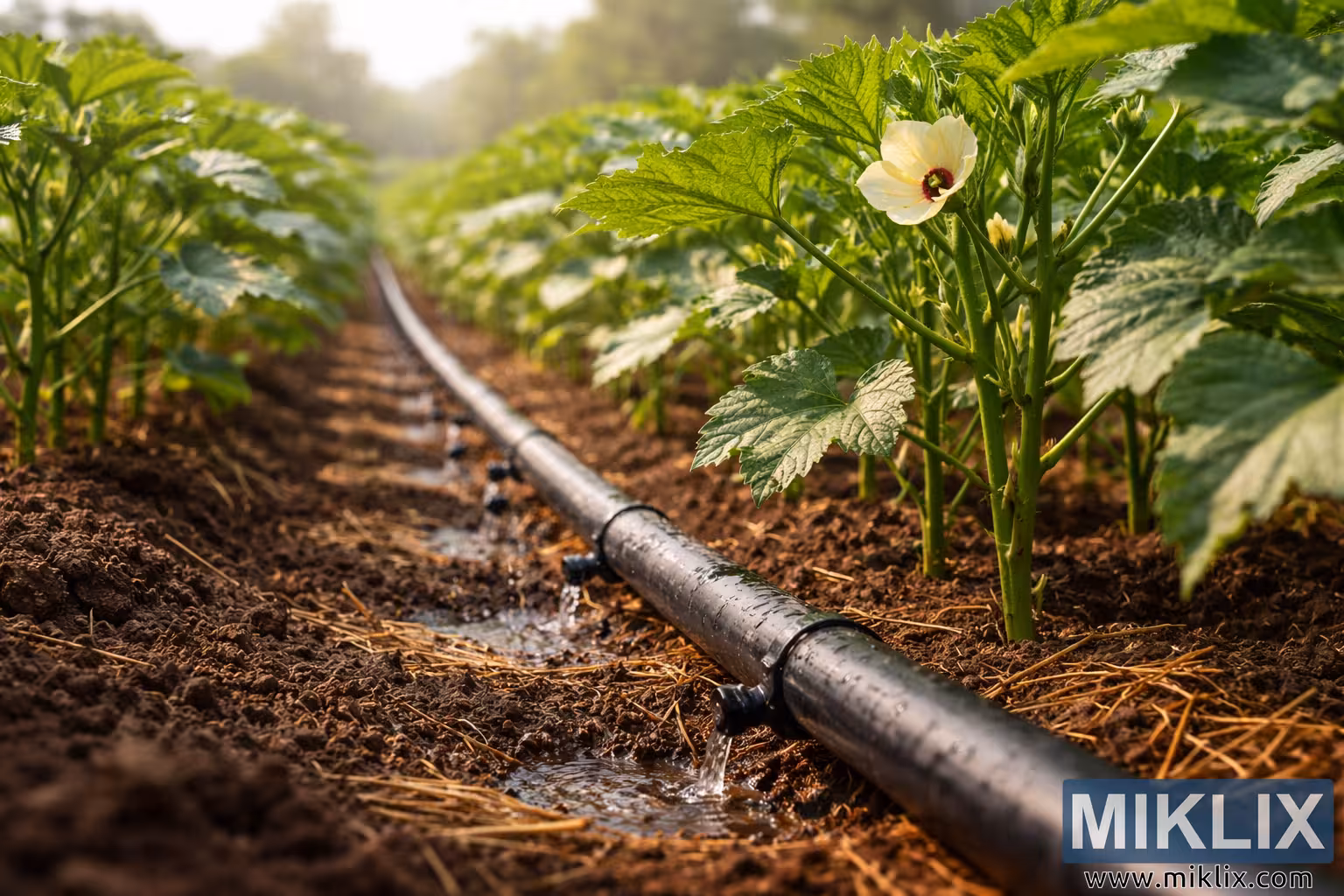 High-resolution landscape image of a drip irrigation system watering rows of okra plants in a fertile field, highlighting efficient agricultural water management.