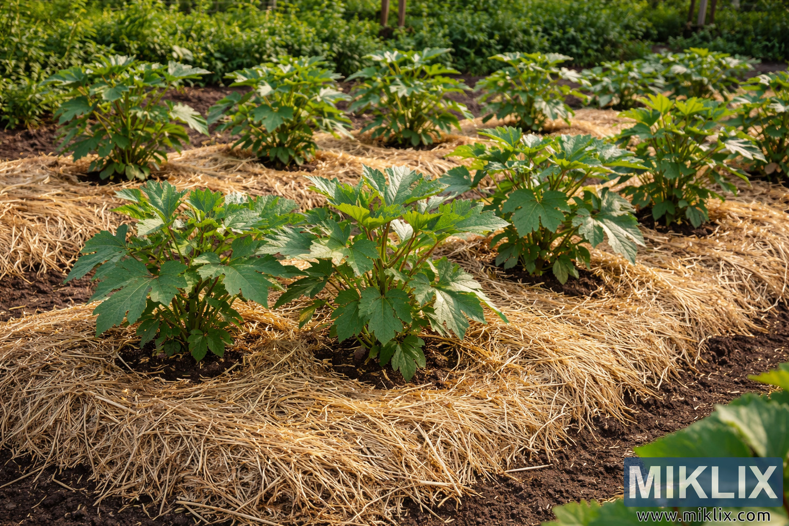 High-resolution landscape photo of healthy okra plants growing in neat rows within a garden bed, each plant surrounded by straw mulch that conserves moisture and suppresses weeds.