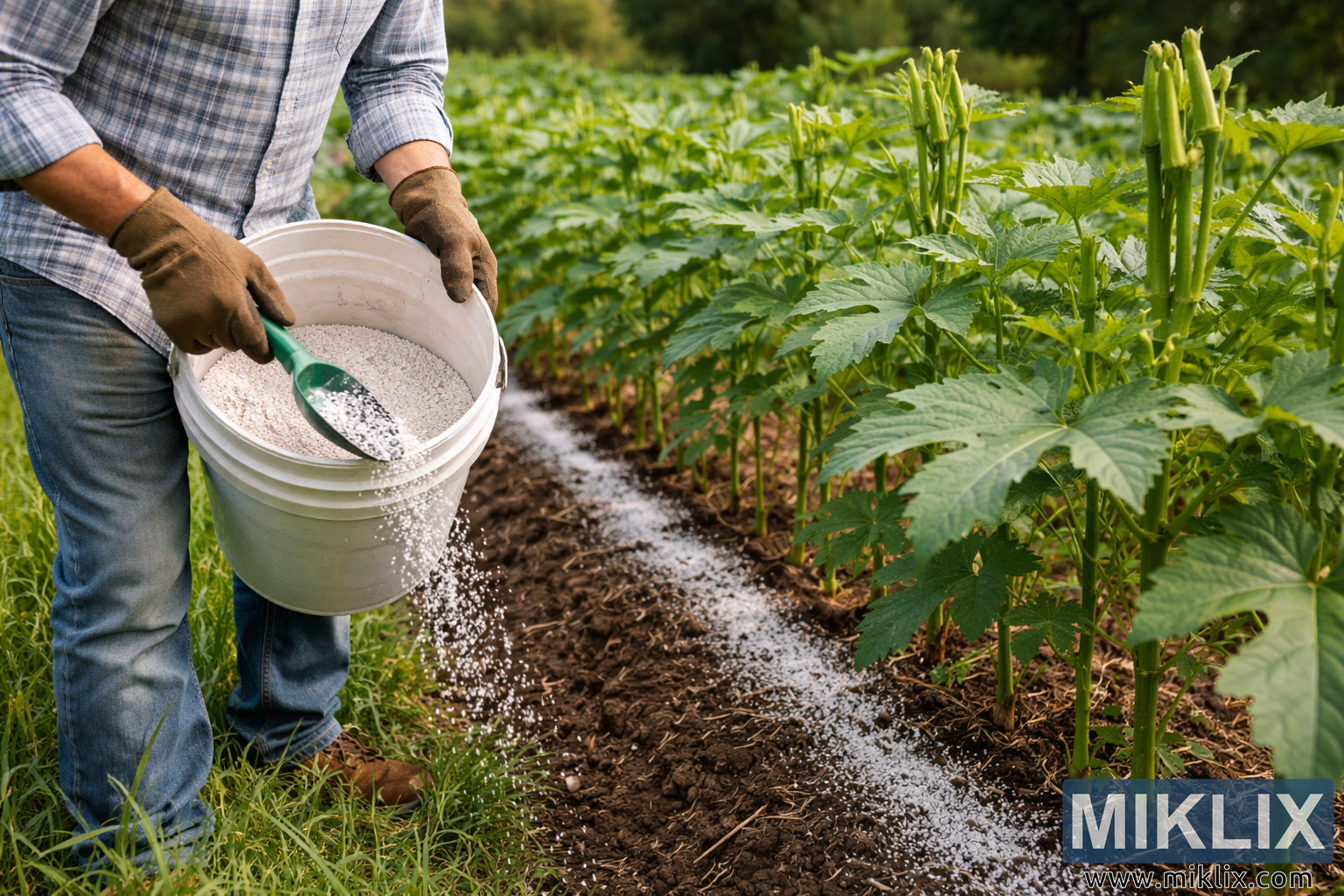 A high-resolution landscape photograph shows a farmer performing side-dressing fertilizer application in a thriving okra field during daylight. The image captures the moment from a close, slightly angled perspective, focusing on the farmer’s torso and hands as fertilizer is carefully distributed along a cultivated crop row. The farmer wears a light blue plaid long-sleeve shirt, sturdy brown work gloves, and denim jeans, attire typical for practical agricultural work. In his hands he holds a large white plastic bucket filled with small white granular fertilizer. A green scoop rests inside the bucket, and the farmer uses it to pour the fertilizer in a controlled stream onto the soil. The granules cascade visibly from the scoop, creating a clear line of nutrients along the side of the crop row.