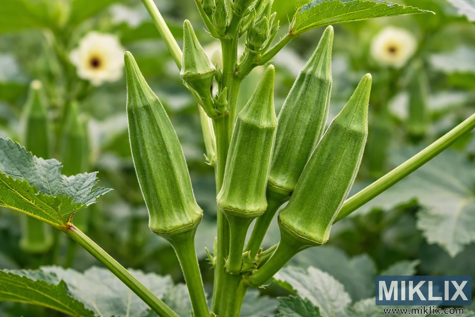 In the softly blurred background, faint yellow okra flowers can be seen scattered among additional foliage. These delicate blossoms, with pale yellow petals and darker centers, hint at the flowering stage that precedes pod development. The background blur creates a pleasing bokeh effect, keeping the viewer’s focus firmly on the sharply detailed pods in the foreground while still conveying the broader garden setting.