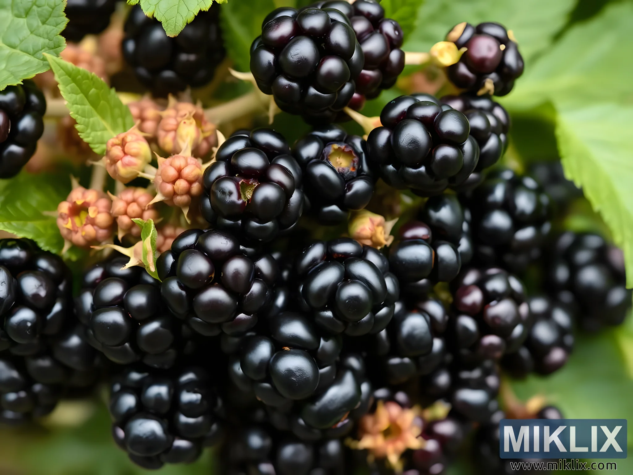 The blackberry bush captured in this image overflows with vitality, its dense cluster of fruit embodying both abundance and the steady rhythm of ripening. The ripe blackberries, with their deep, almost inky sheen, draw the eye immediately, each one plump and perfectly formed, their glossy surfaces glistening as they catch the light. Composed of countless tiny drupelets tightly packed together, the berries display a bumpy yet structured texture, giving them a rich and tactile appeal. Their black coloration is not flat but alive with subtle undertones—hints of deep purple and maroon shimmer just beneath the surface, adding dimension to their otherwise dark skin. Each berry seems swollen with juice, suggesting the sweetness and tartness that only peak-ripened fruit can deliver.