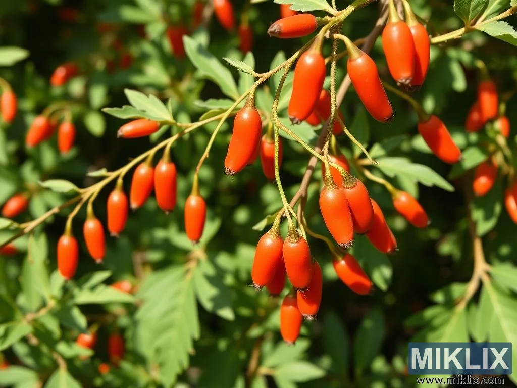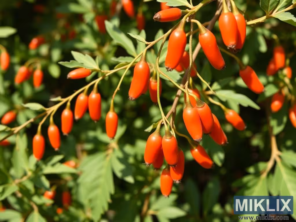 Glossy red goji berries hang in clusters from slender green branches, contrasting with fresh lance-shaped leaves in a vibrant, healthy scene.