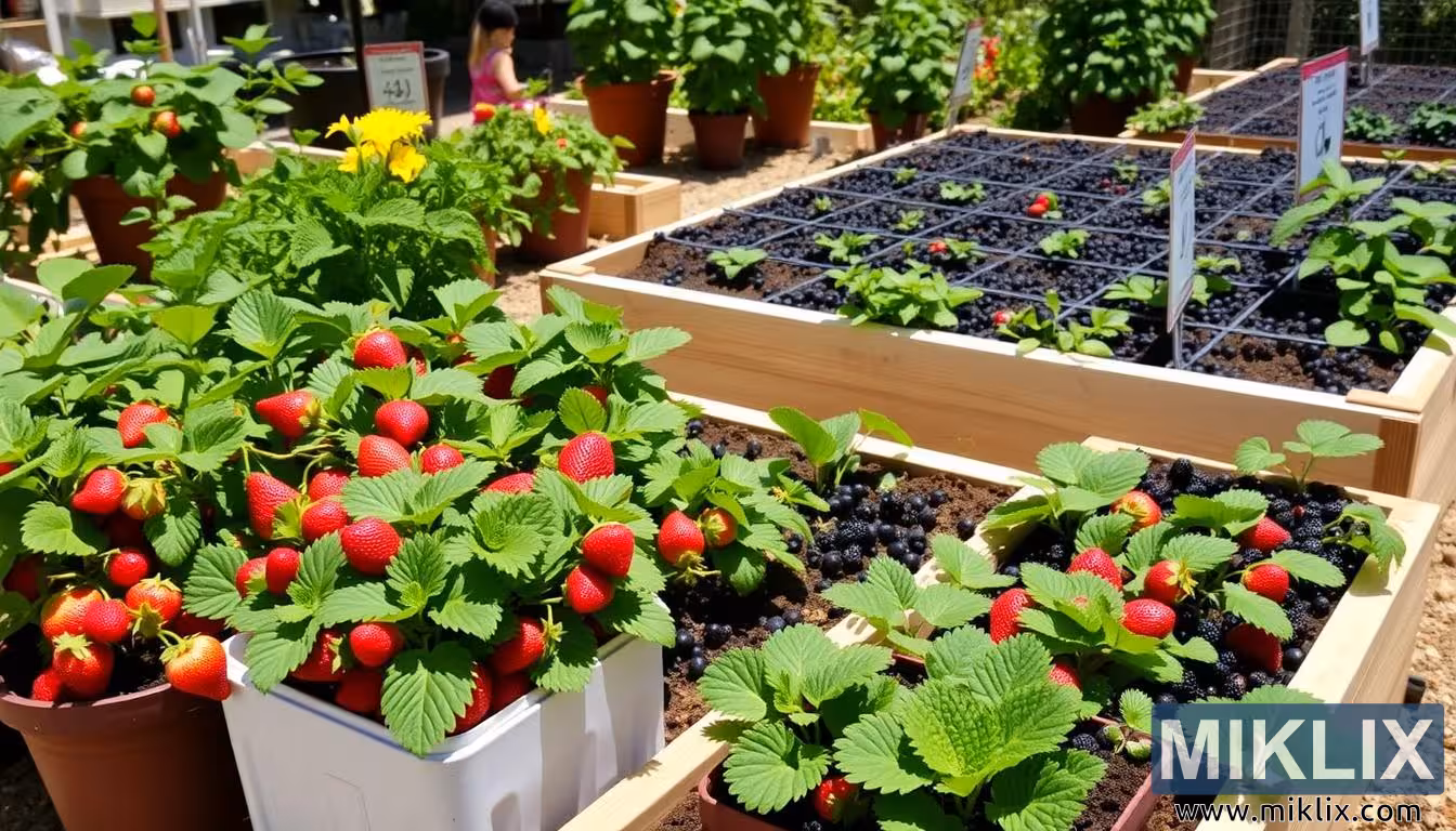 A vibrant berry garden with strawberries, blackberries, and leafy greens in raised beds and pots, showcasing growth and summer abundance.
