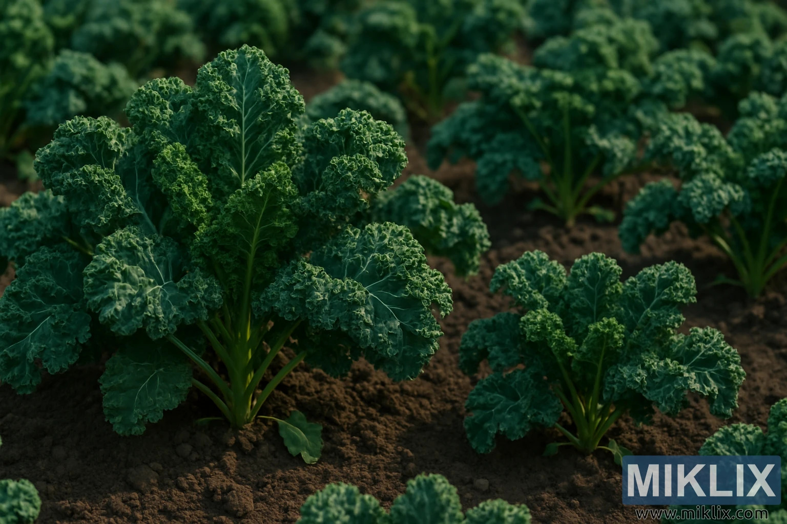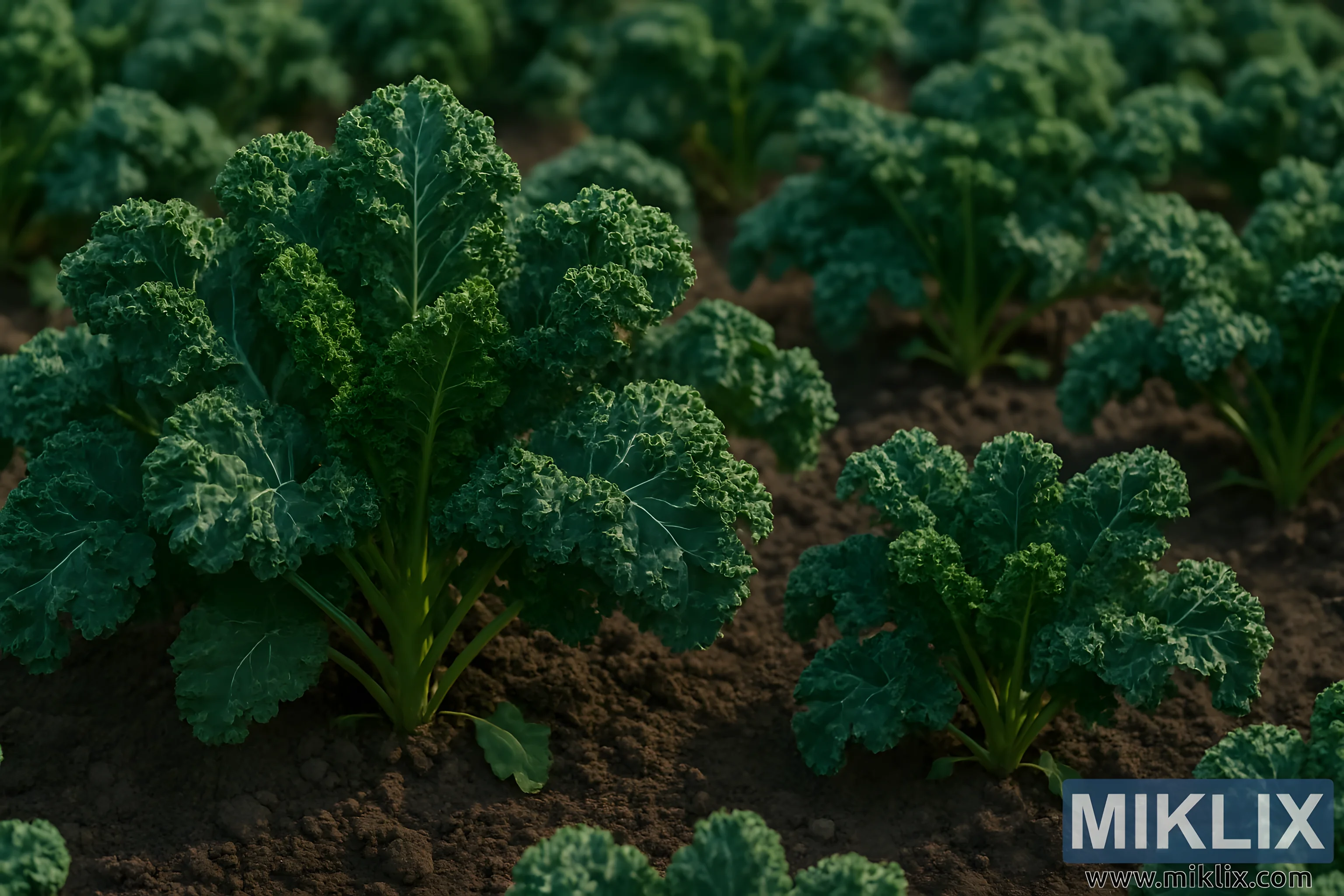 In the heart of a well-tended garden, a vibrant field of kale stretches across the soil in orderly rows, each plant a testament to the harmony between nature and nurture. The scene is bathed in soft, natural sunlight that filters gently through the open sky, casting a warm glow over the landscape and bringing out the rich textures and colors of the thriving crop. The kale leaves, deep green and intricately curled, rise from the earth with a kind of quiet confidence, their crinkled surfaces catching the light in a way that highlights their vitality and freshness.