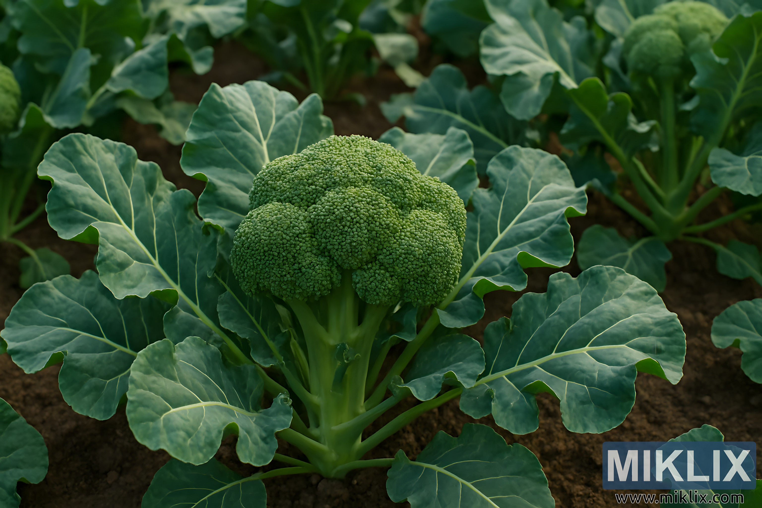 A lush garden of broccoli plants with dense green heads and broad veined leaves growing in dark soil, highlighted by natural sunlight for a vibrant look.