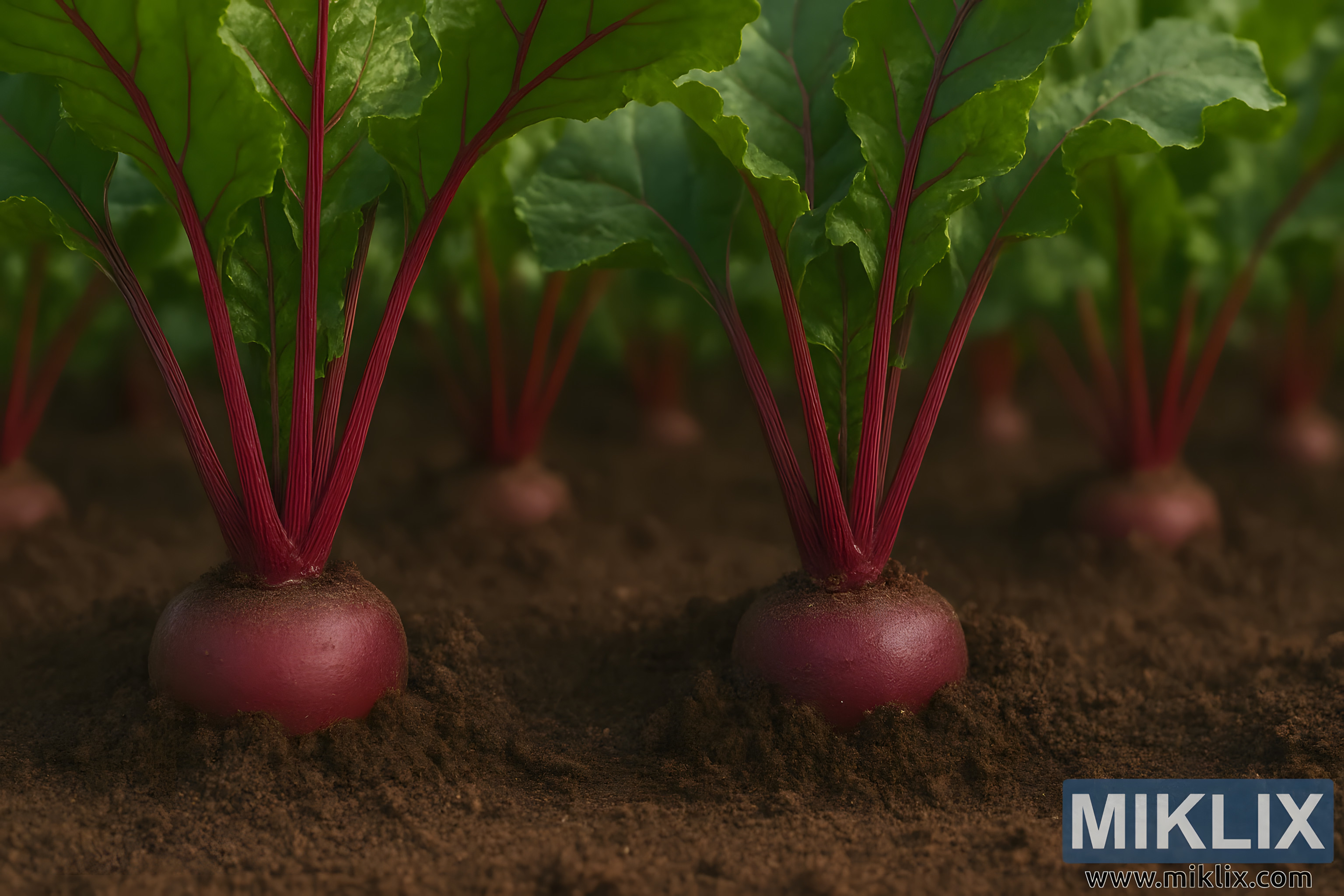 At the base of each plant, the rounded tops of the beetroots peek through the soil, their deep red hue hinting at the richness hidden below. These crowns are smooth and firm, their curves subtle and organic, suggesting the slow, deliberate process of growth that defines root vegetables. Most of the beet remains underground, protected and developing, with only the uppermost portion exposed to the air. This partial visibility adds a layer of authenticity to the scene, capturing the quiet anticipation of harvest and the beauty of food in its natural state.