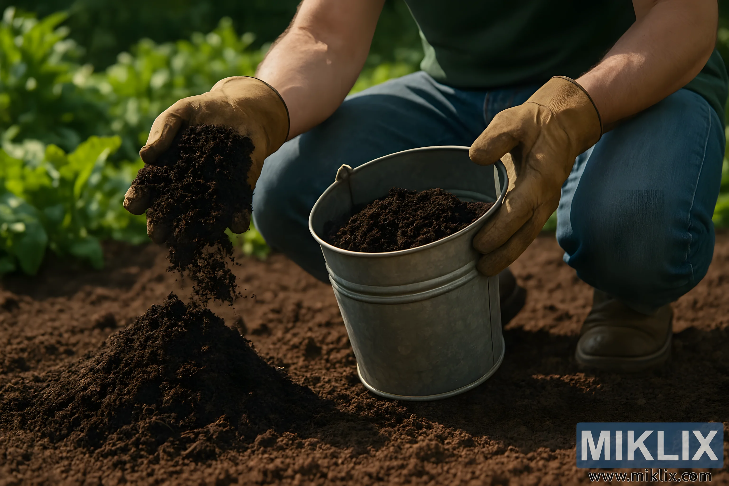 A gardener kneels in a lush garden, scooping dark compost from a bucket onto tilled soil, with green plants blurred in the background.