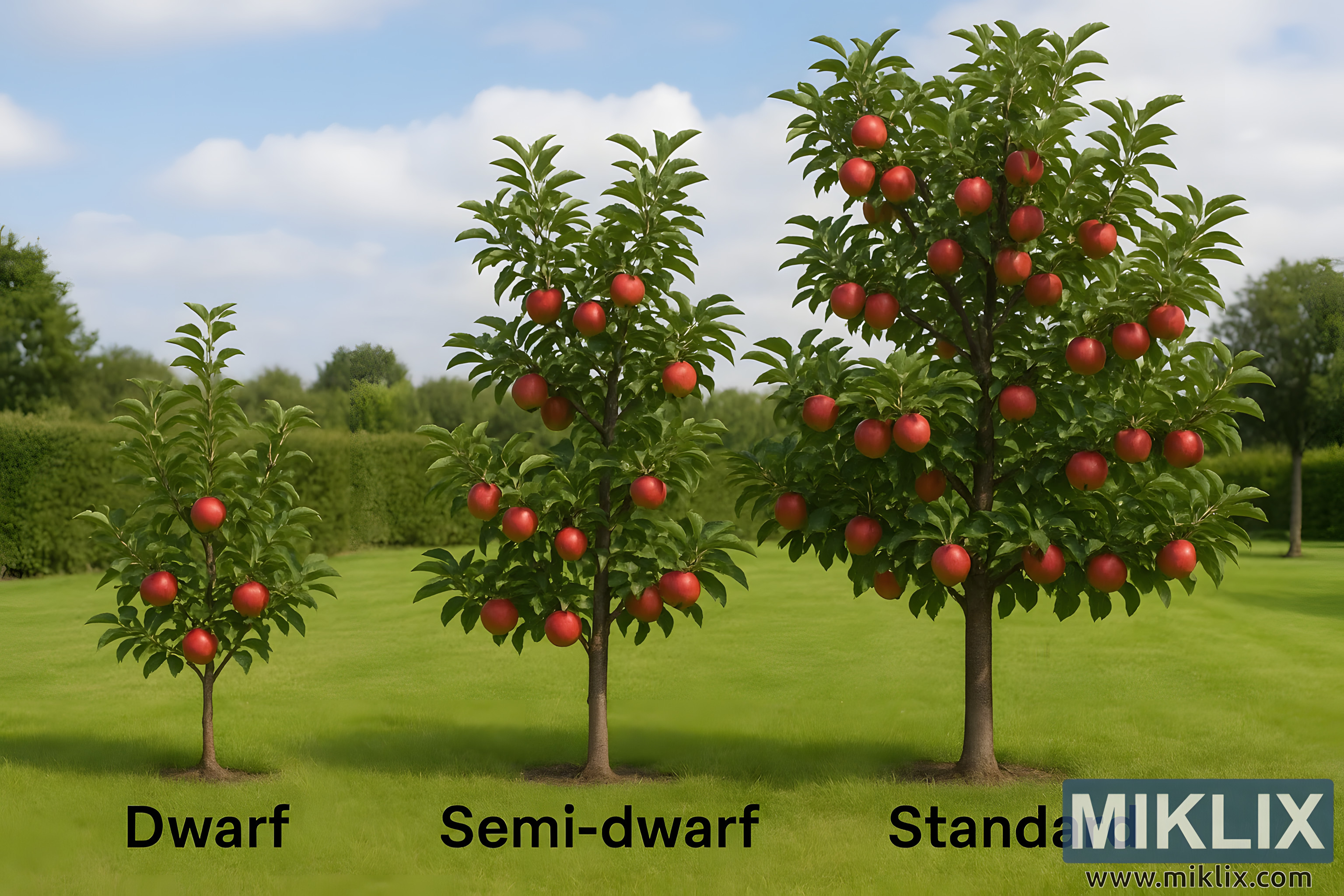Together, the three trees create a clear, educational, and visually pleasing comparison of apple tree growth habits. The progression from dwarf to semi-dwarf to standard captures not only physical size but also the essence of orchard planning, illustrating how tree size can influence maintenance, harvest convenience, and spatial arrangement in both home gardens and commercial orchards.
