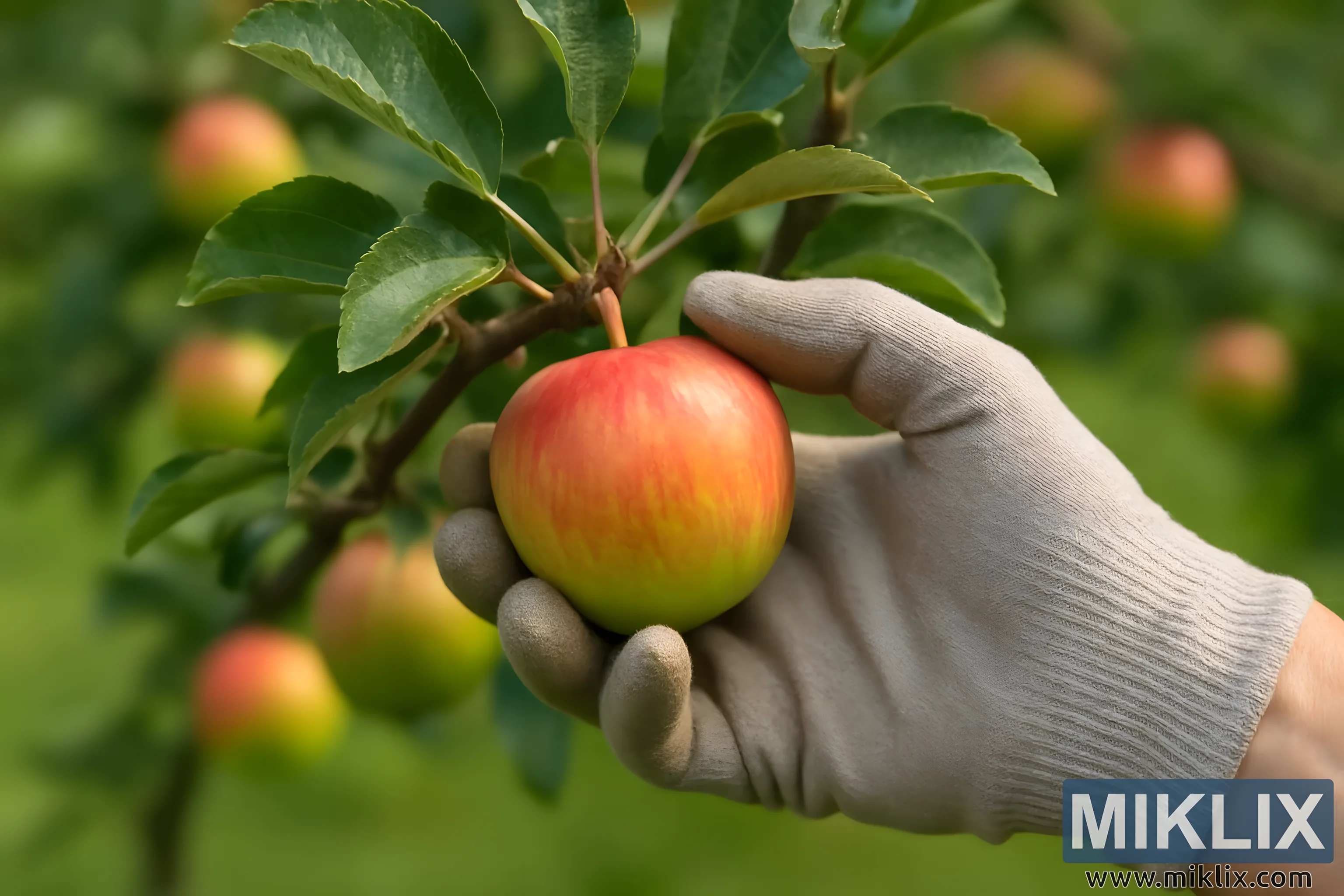 Close-up of a gardener’s gloved hand cupping and twisting a red-and-gold apple on the tree, checking for ripeness amid green leaves in a thriving orchard.