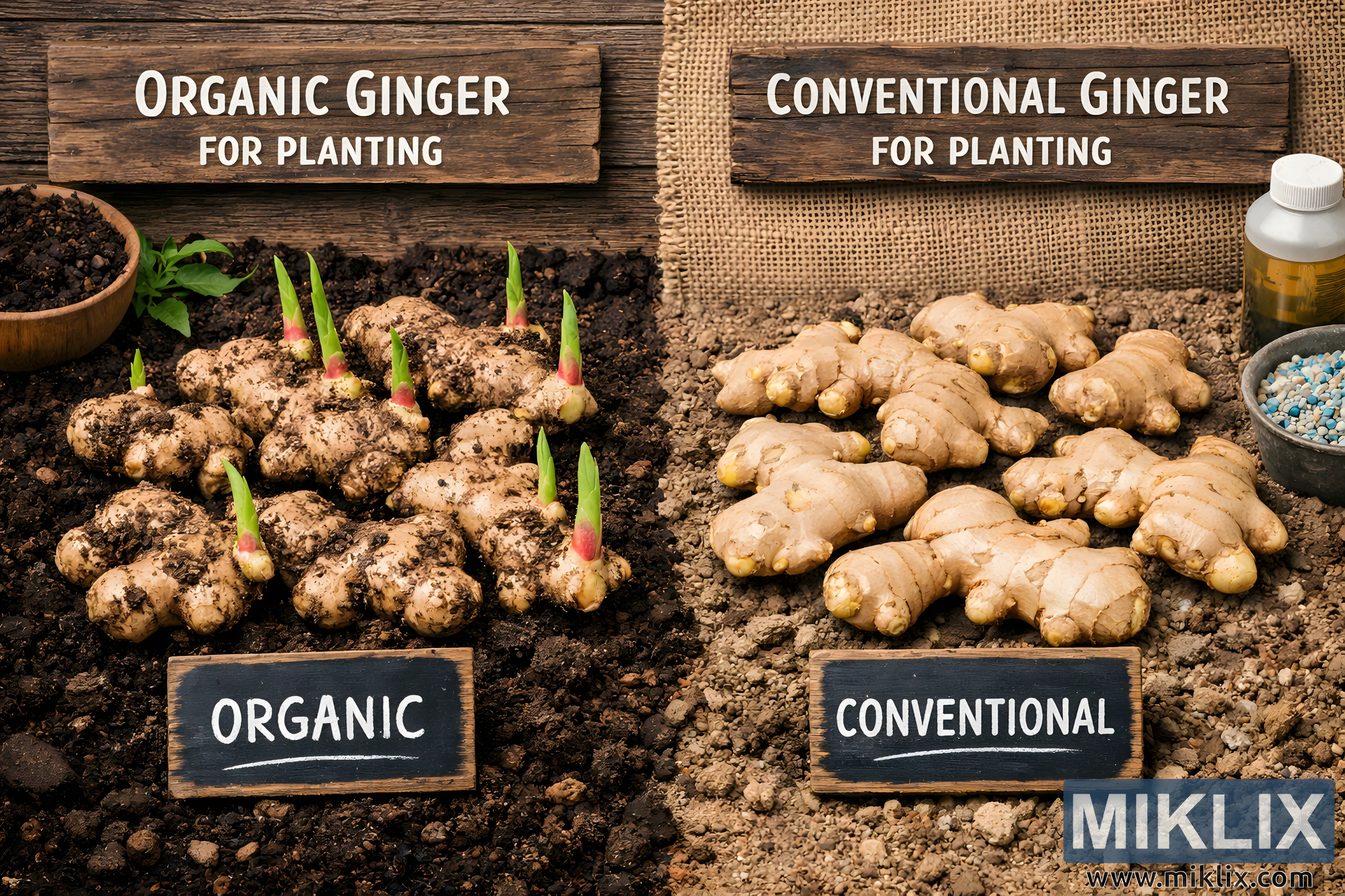 Landscape image comparing organic and conventional ginger rhizomes for planting, highlighting visual differences in sprouting, soil, and cultivation style.