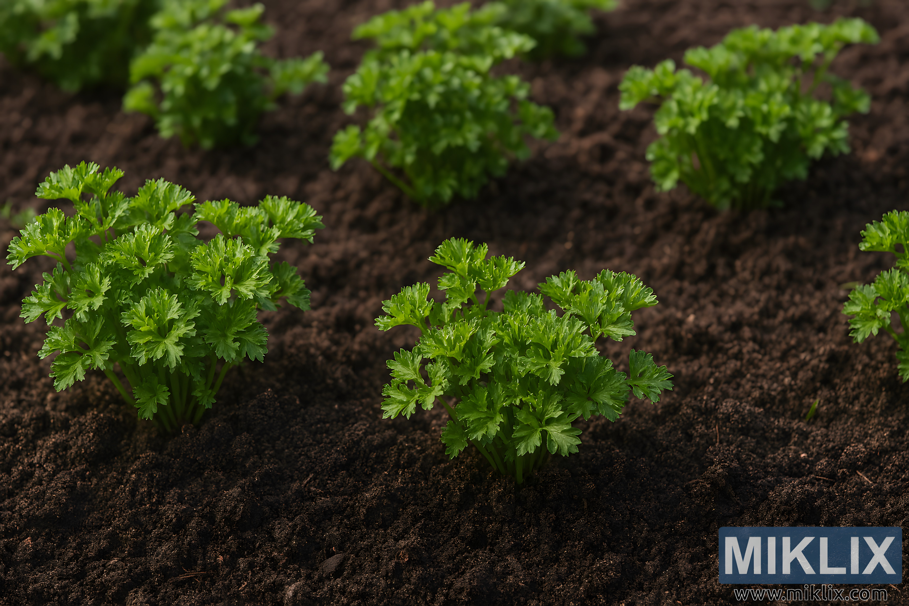 High-resolution image of vibrant parsley plants flourishing in a meticulously prepared garden bed with rich, dark soil.