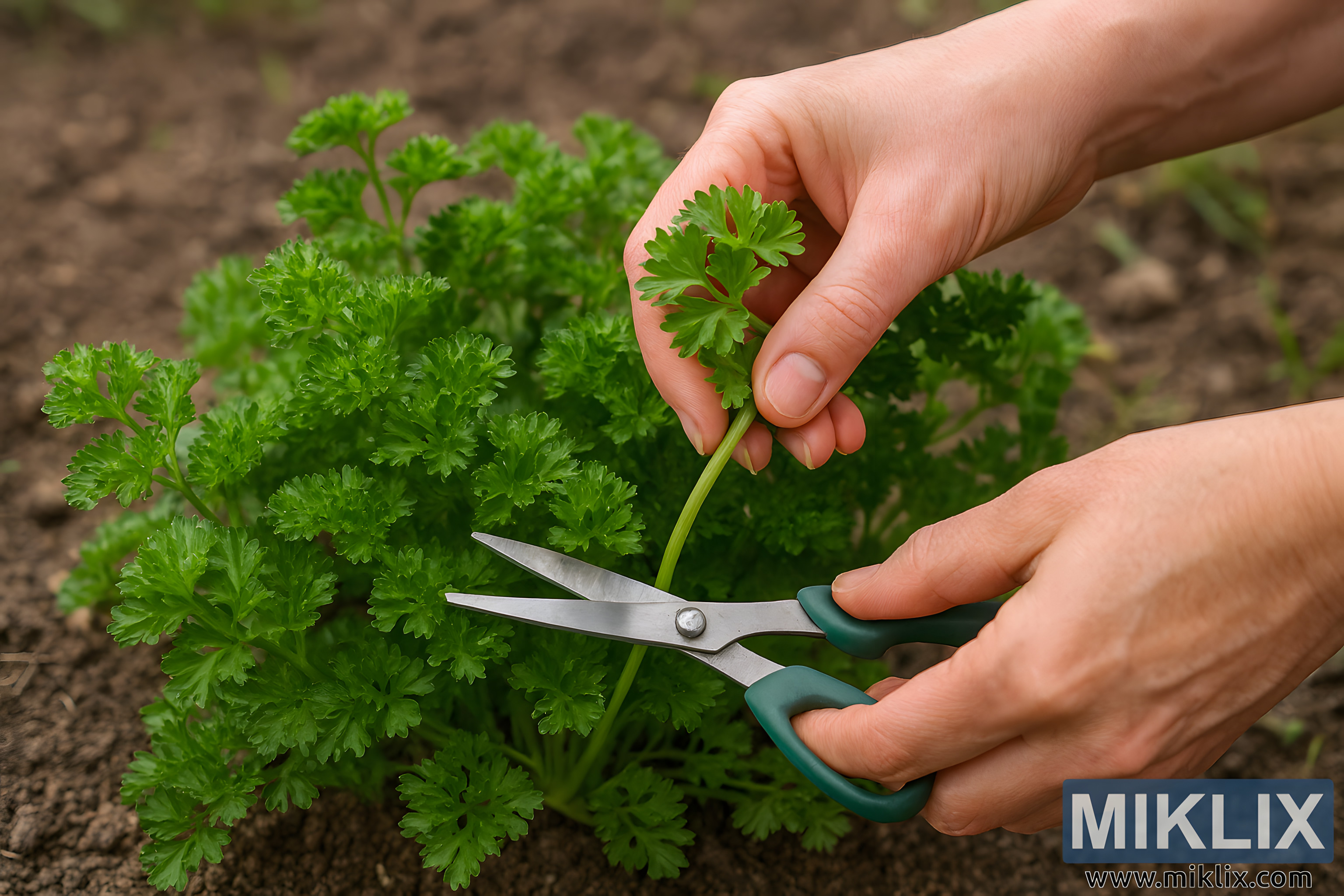 Learn the correct method for harvesting parsley by trimming outer stems with scissors, preserving plant health and promoting regrowth.