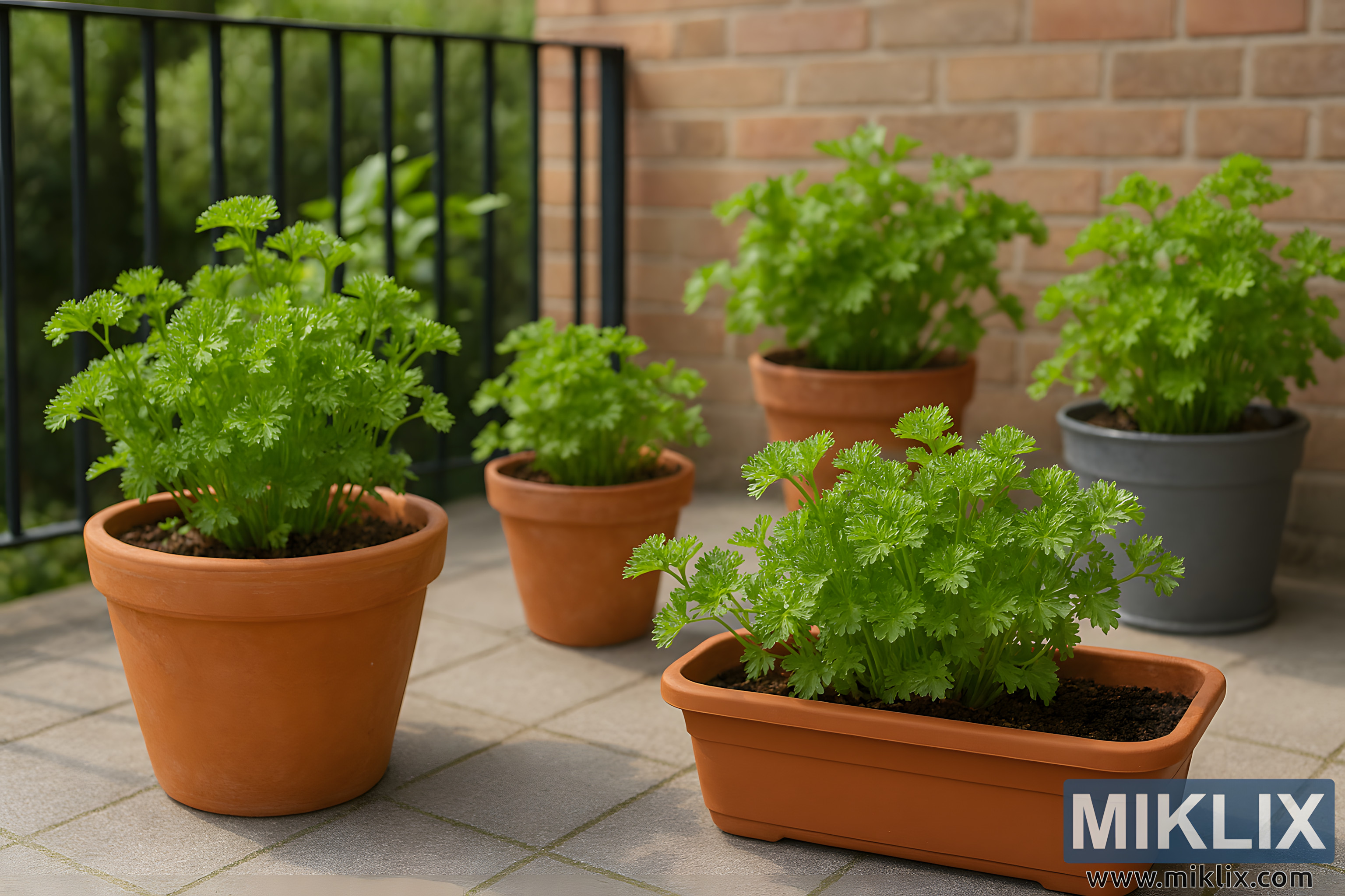 High-resolution landscape photo of parsley growing in diverse containers on a bright patio or balcony, featuring terracotta pots, plastic planters, and lush green foliage.