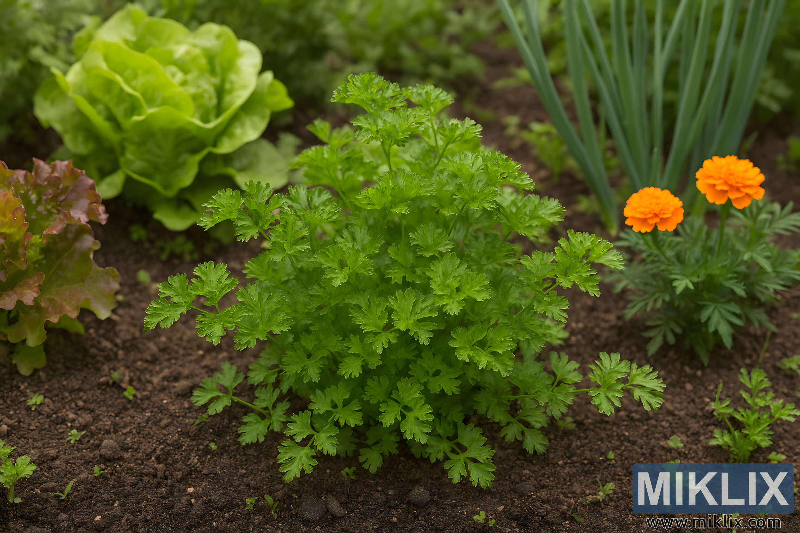 This image exemplifies a harmonious companion planting setup, where parsley benefits from the presence of lettuce, marigolds, and onions—plants known to deter pests and support healthy growth. The scene conveys a sense of balance, vitality, and attentive cultivation, ideal for educational, culinary, or gardening-focused visual storytelling.