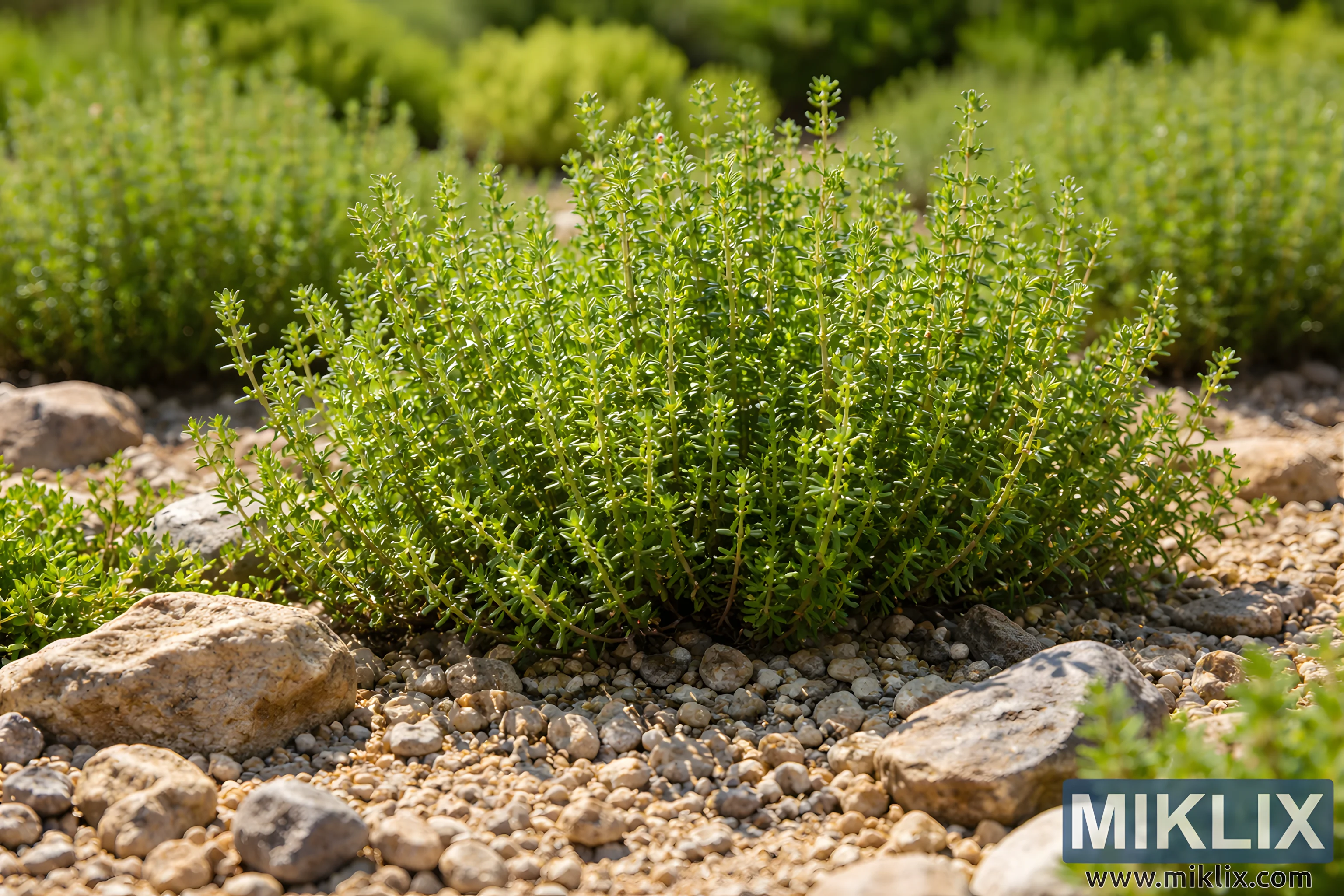 High-resolution photo of thyme plants thriving in full sun, growing in well-drained rocky soil, ideal for herb gardening and Mediterranean landscapes.