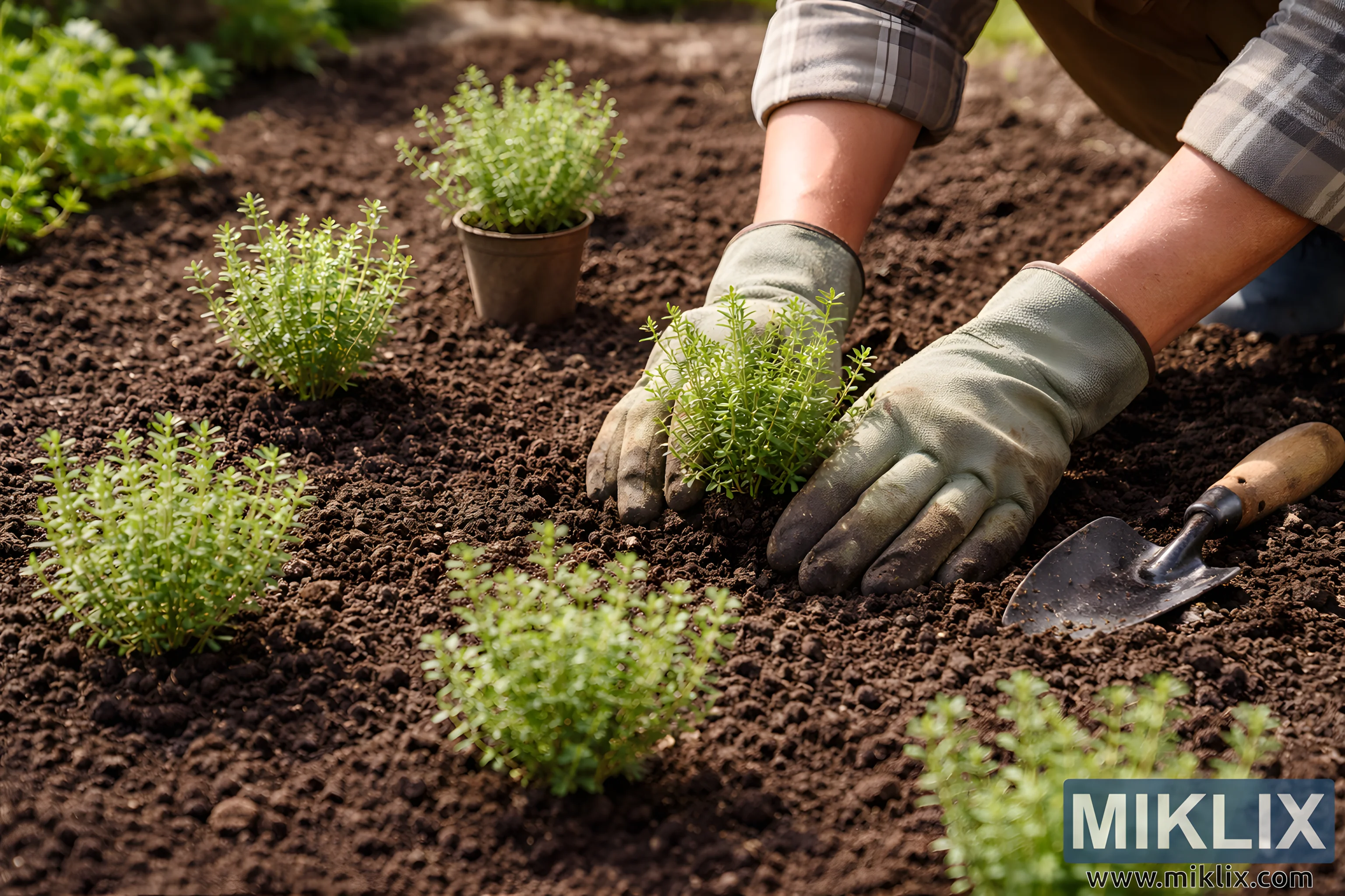 High-resolution photo of a gardener planting thyme seedlings with proper spacing in fertile garden soil, illustrating careful herb gardening technique and outdoor cultivation.