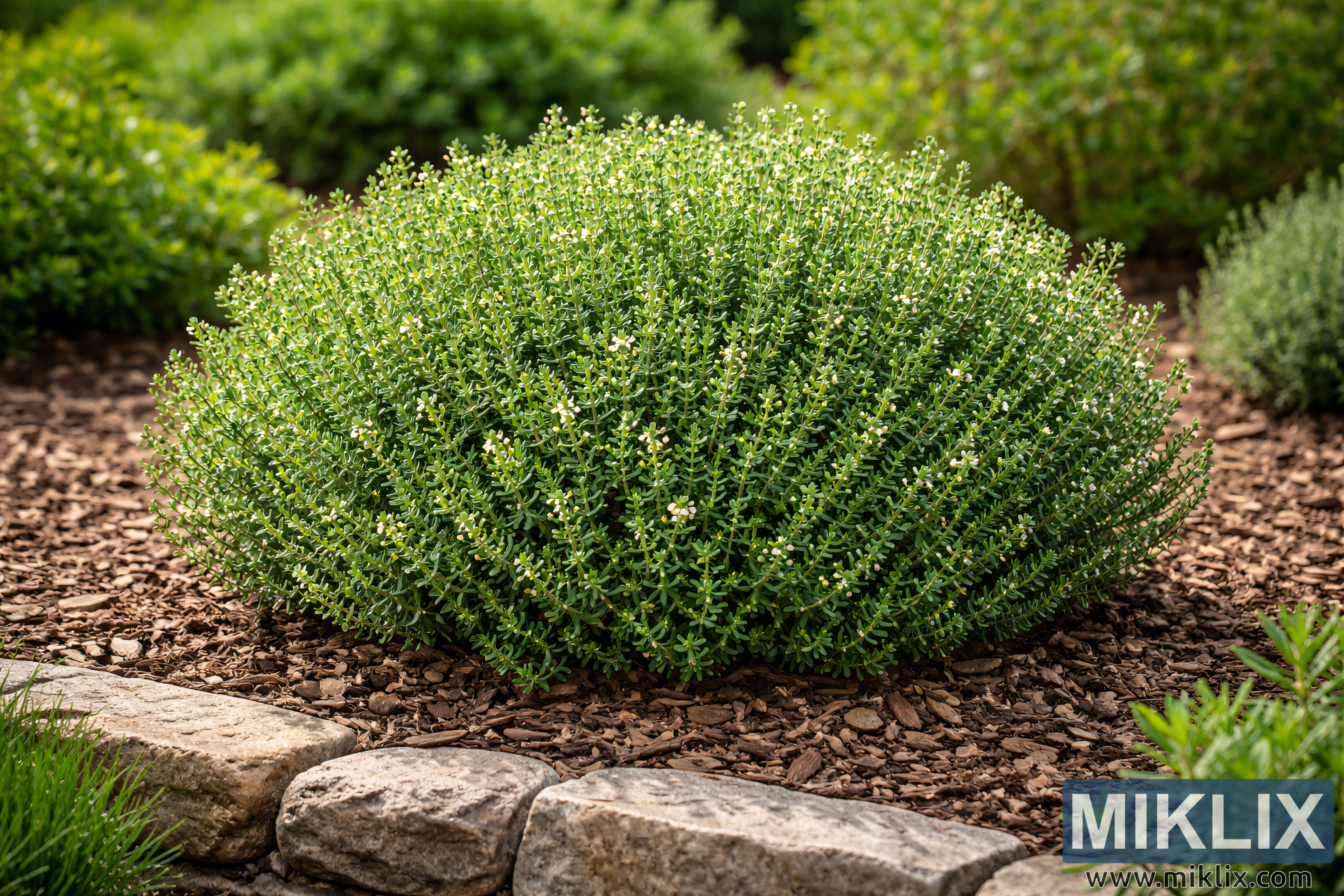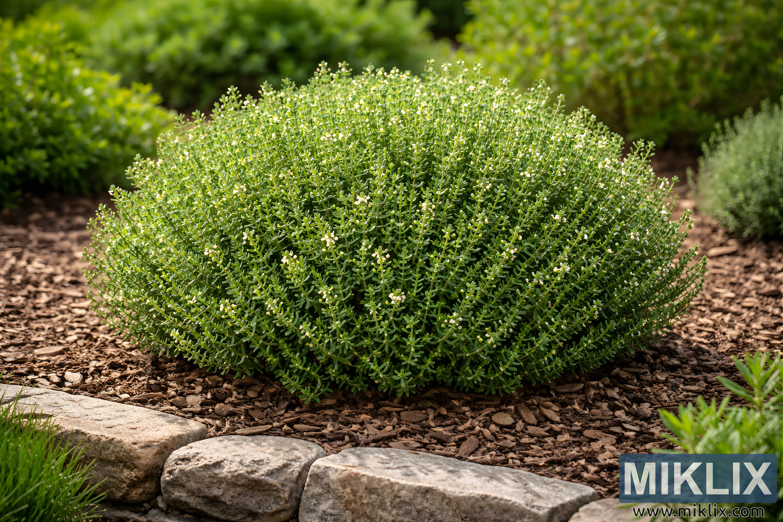 The image presents a high-resolution, landscape-oriented photograph of a well-maintained thyme plant growing outdoors in a carefully tended garden bed. The thyme forms a dense, rounded mound with compact, woody stems and an abundance of small, oval, deep-green leaves that appear healthy, uniform, and vibrant. Tiny pale blossoms are scattered lightly across the upper surface of the plant, suggesting it is either in early bloom or just past peak flowering. The plant has been expertly pruned, resulting in a symmetrical, cushion-like shape that reflects attentive and knowledgeable care. Surrounding the base of the thyme is a generous layer of organic mulch composed of small wood chips and bark fragments, evenly distributed to help retain moisture, regulate soil temperature, and suppress weeds. The mulch contrasts warmly with the rich green foliage, emphasizing the plant as the focal point of the composition. A low border of natural stone runs along the foreground edge of the garden bed, providing structure and visual definition while reinforcing a rustic, well-designed aesthetic. In the softly blurred background, additional greenery and similar herbaceous plants are visible, arranged in neat rows that imply an orderly herb garden or landscaped backyard setting. The lighting appears natural and diffused, likely from gentle sunlight, which enhances texture without creating harsh shadows. Fine details such as leaf structure, branching patterns, and the texture of the mulch are rendered with exceptional clarity, giving the image a realistic and tactile quality. Overall, the photograph conveys a sense of calm, sustainability, and careful horticultural practice, illustrating an ideal example of thyme cultivation with proper mulching, pruning, and spacing in a healthy garden environment.