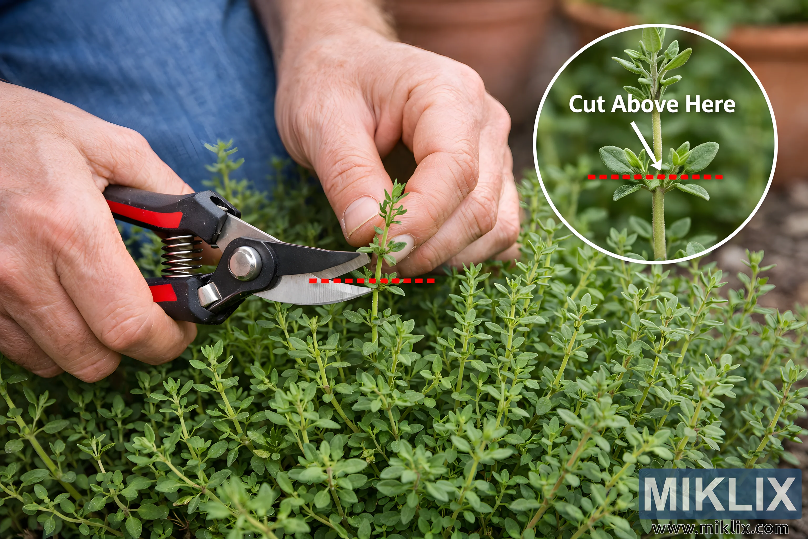 High-resolution instructional image showing the correct way to prune thyme plants, featuring hands with pruning shears cutting a stem above a leaf node for healthy growth.