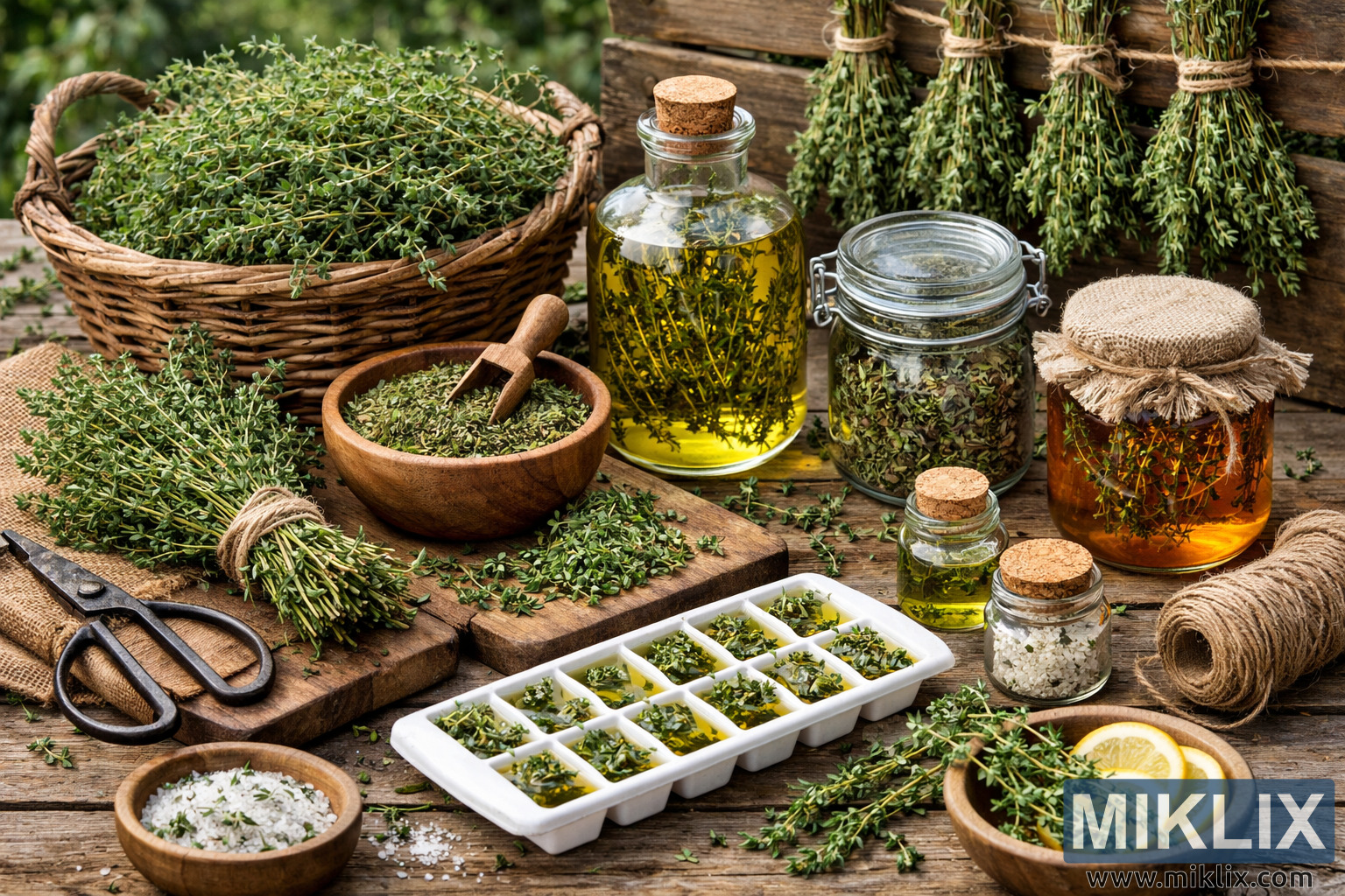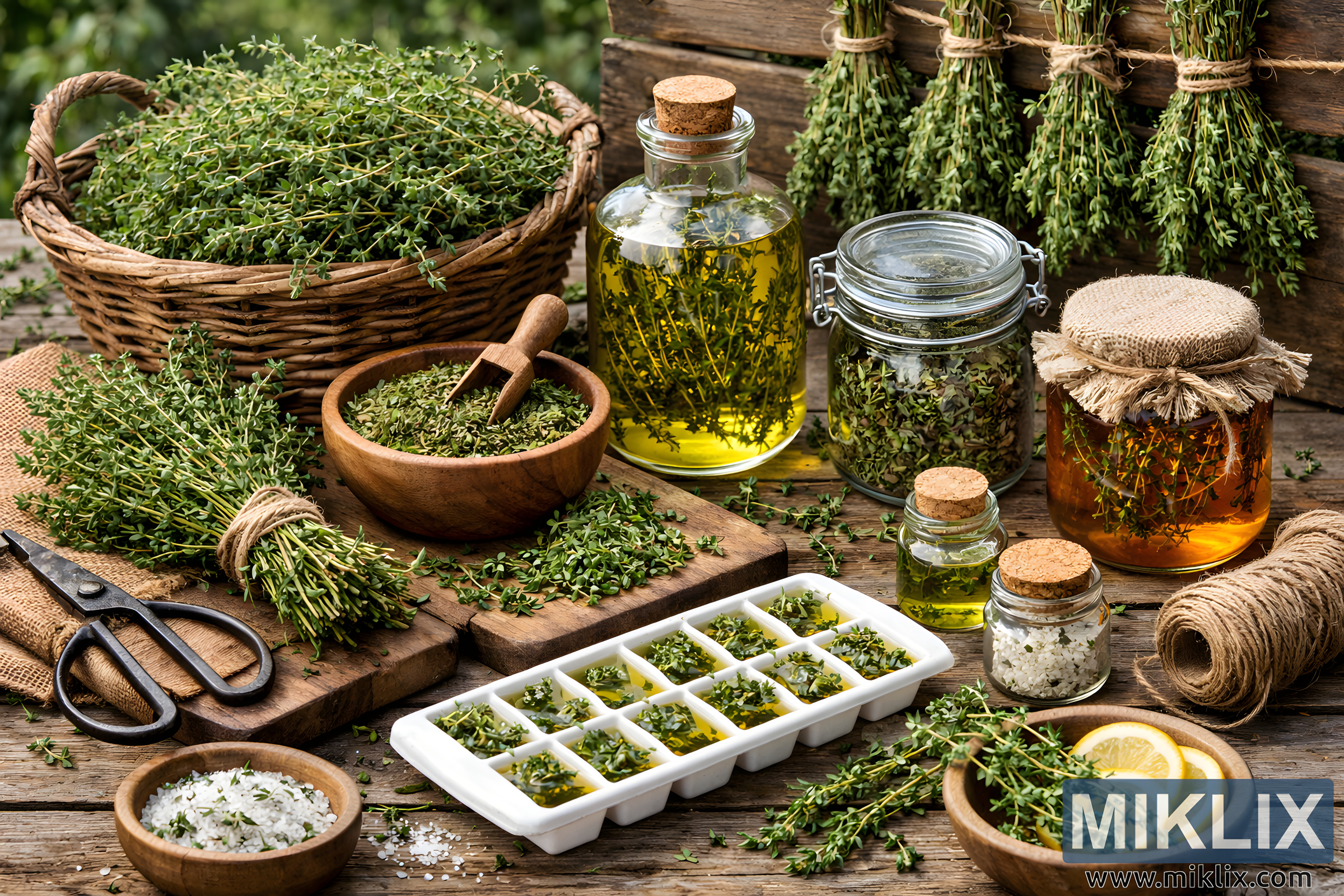 A rustic still-life image depicting the harvest and preservation of thyme using traditional and modern methods, including drying, oil infusion, freezing, and herb-infused salt.