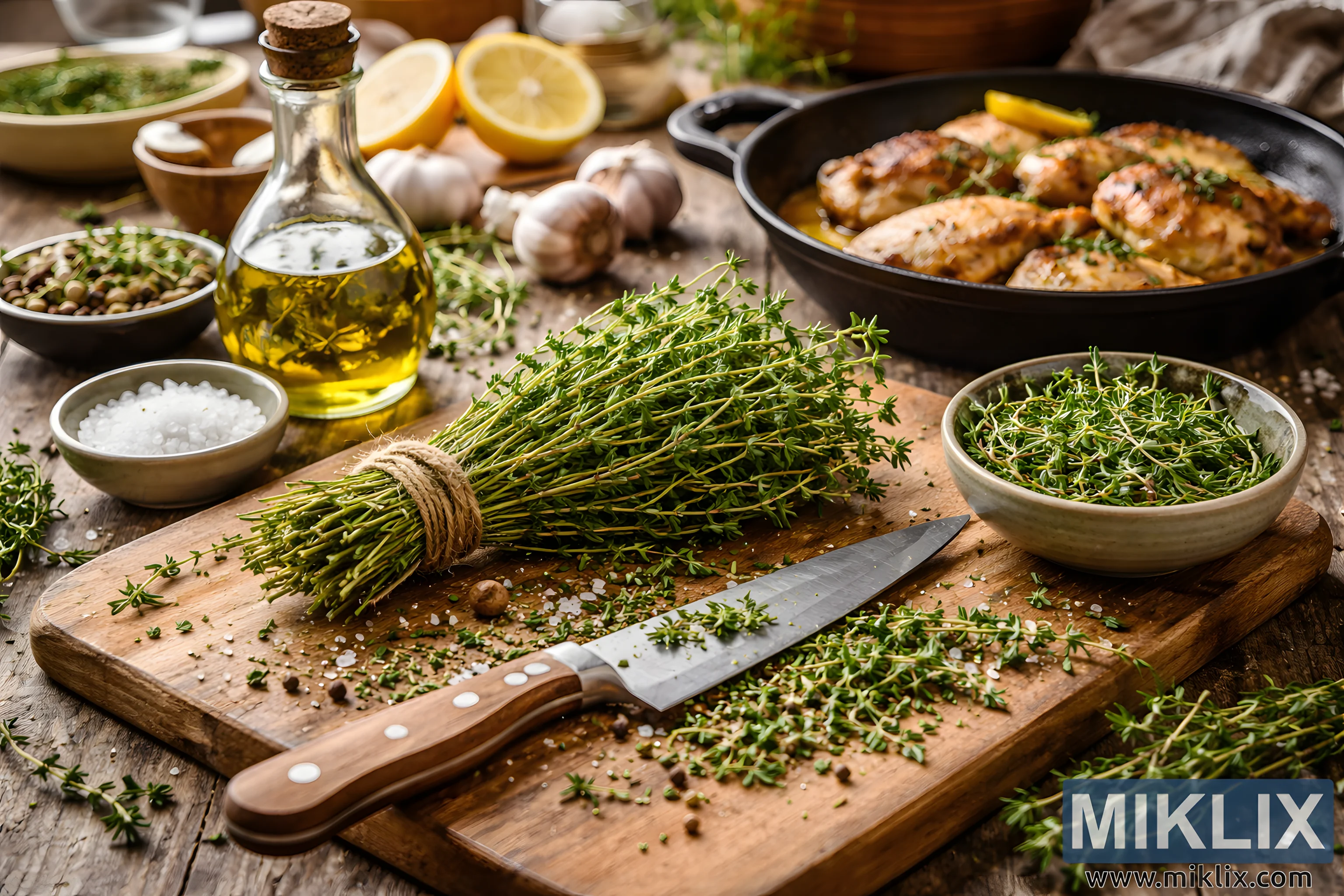 The image presents a richly detailed, landscape-oriented culinary still life centered on fresh thyme being actively used in cooking. In the foreground, a generous bundle of vibrant green thyme sprigs rests on a well-worn wooden cutting board, tied loosely with natural twine. Individual leaves and small stems are scattered across the board, suggesting recent chopping and hands-on preparation. A chef’s knife with a wooden handle lies nearby, its blade lightly dusted with thyme fragments, reinforcing the sense of an ongoing cooking process rather than a staged display. Surrounding the board are small ceramic bowls holding coarse sea salt, mixed peppercorns, and additional chopped thyme, each element carefully placed but naturally imperfect. To the left, a clear glass bottle filled with golden olive oil catches warm light, creating soft reflections that add depth and warmth to the scene. In the midground and background, complementary ingredients expand the culinary narrative: whole garlic bulbs with papery skins intact, halved lemons with visible pulp, and a shallow bowl of green herb sauce or marinade. On the right side of the composition, a dark cast-iron skillet holds roasted chicken thighs, their surfaces browned and glistening, speckled with herbs and accompanied by lemon slices and garlic cloves. Fresh thyme is visibly used as a finishing herb on the chicken, visually connecting the raw ingredient on the cutting board to the finished dish. The background remains softly out of focus, emphasizing depth while maintaining a cohesive rustic kitchen atmosphere. The lighting is warm and natural, as if coming from a nearby window, highlighting textures such as the grain of the wood, the delicate leaves of the thyme, and the crisped skin of the chicken. Overall, the image conveys freshness, aroma, and the versatility of thyme in savory cooking, capturing a moment that bridges preparation and presentation in a comforting, home-style culinary environment.