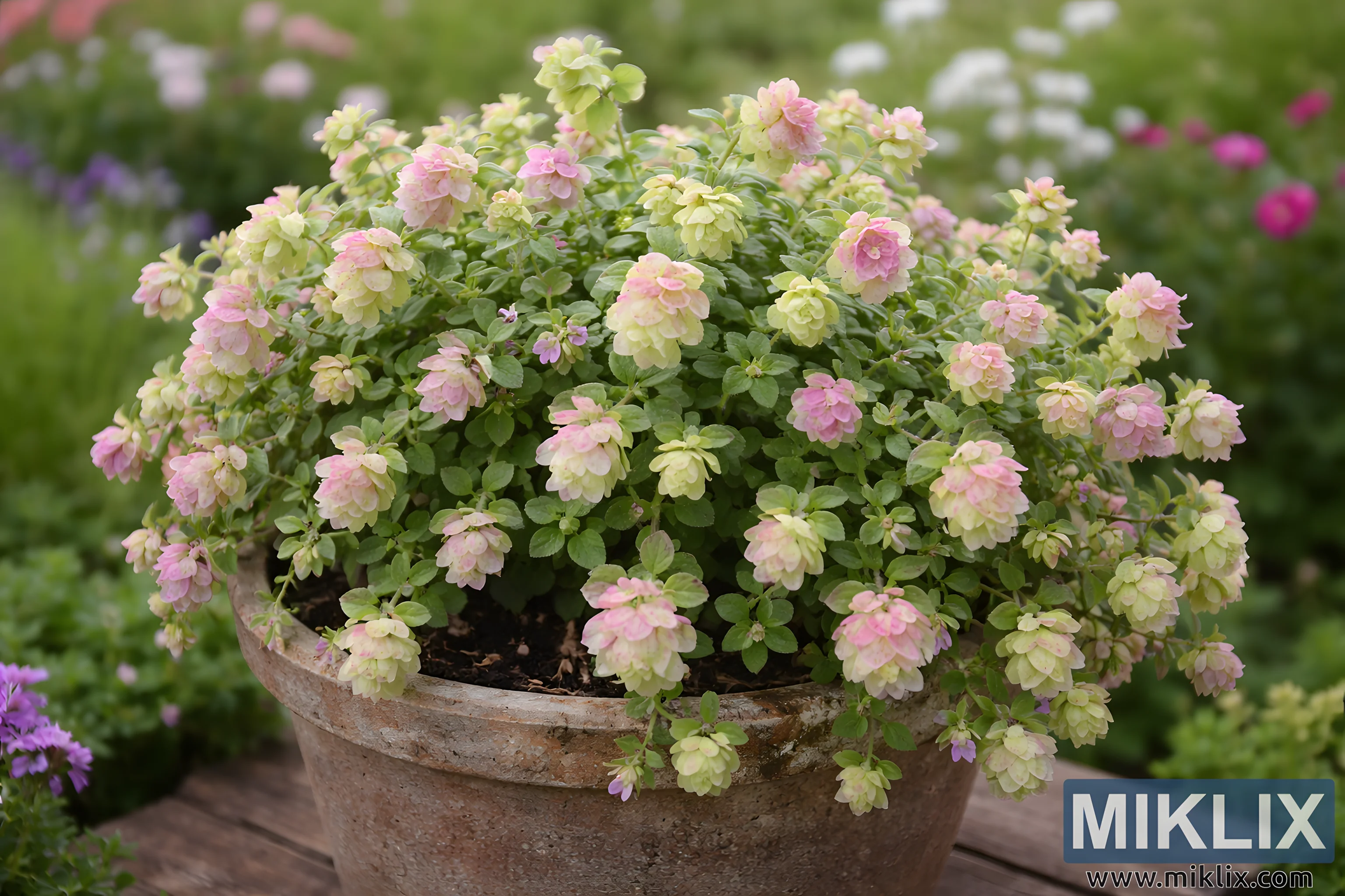 Photograph of an ornamental oregano plant growing in a terracotta container, featuring soft green and pink bracts and a blurred garden background, ideal for gardening and plant design content.