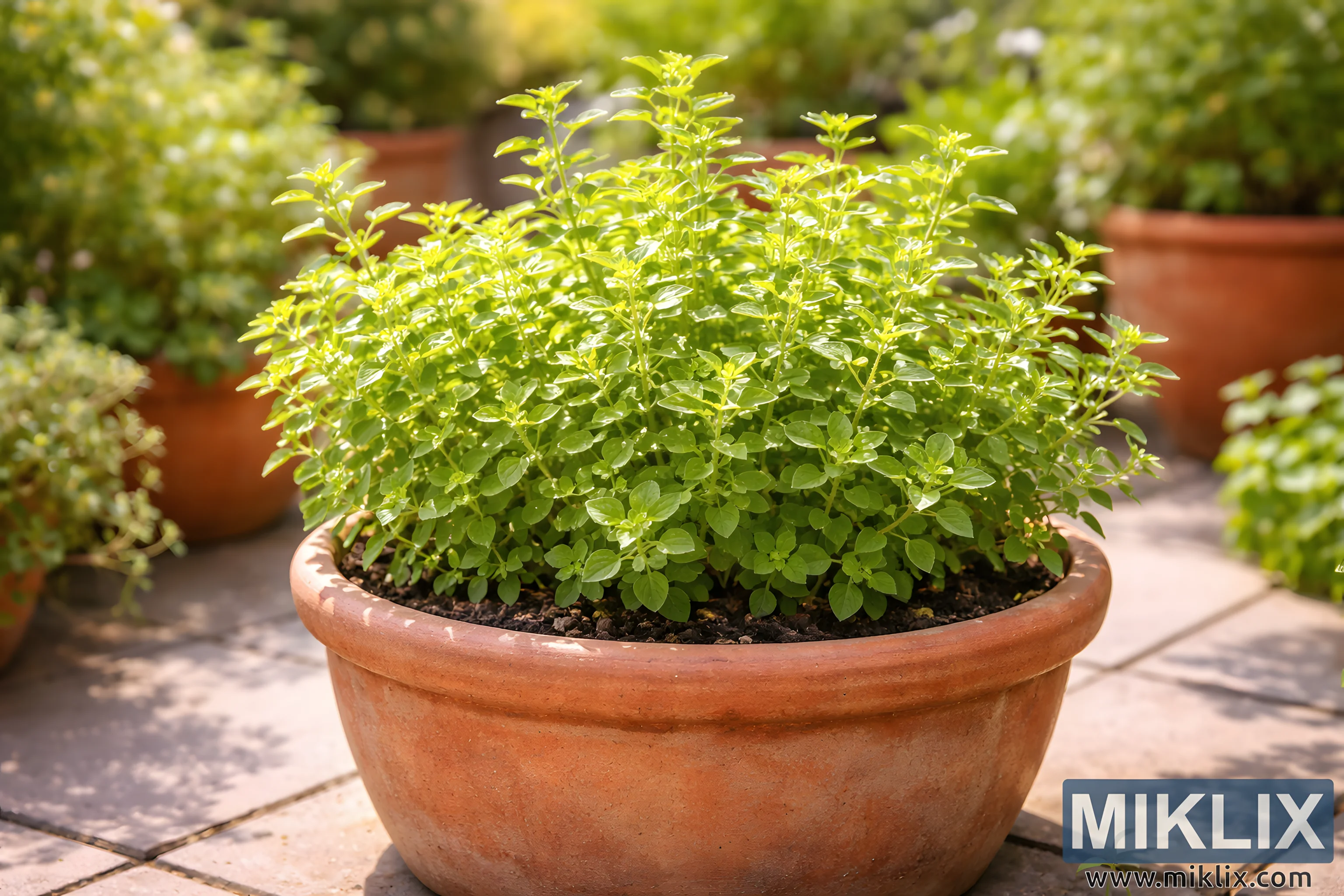 The image shows a healthy oregano plant growing in a rounded terracotta container placed on a sunlit patio. The oregano appears dense and vigorous, with many upright stems branching outward to form a compact, bushy mound. Its leaves are small, oval, and a vibrant medium green, with slightly lighter new growth visible at the tips, suggesting an actively growing plant. The leaves have smooth edges and a soft, matte texture that catches the sunlight gently rather than reflecting it harshly. The terracotta pot has a warm, earthy orange-brown tone with subtle variations in color, typical of fired clay, and a slightly weathered surface that adds a natural, rustic character. The rim of the container is thick and rounded, framing the dark, moist soil inside, where small granules and organic matter can be seen around the base of the plant. The patio surface beneath the pot is made of stone or concrete tiles arranged in a neat pattern, showing light wear and faint stains that suggest regular outdoor use. In the background, additional terracotta pots filled with greenery are visible but softly blurred, creating a shallow depth of field that keeps the oregano as the clear focal point. The lighting is bright and natural, likely midday sunlight, casting soft, short shadows beneath the pot and highlighting the fresh, aromatic quality associated with culinary herbs. The overall mood of the image is calm and inviting, evoking a sense of home gardening, Mediterranean warmth, and the simple pleasure of growing herbs outdoors. The composition balances clarity and softness, with crisp detail on the oregano leaves and a gently diffused background that suggests a well-tended patio garden without distracting from the main subject.