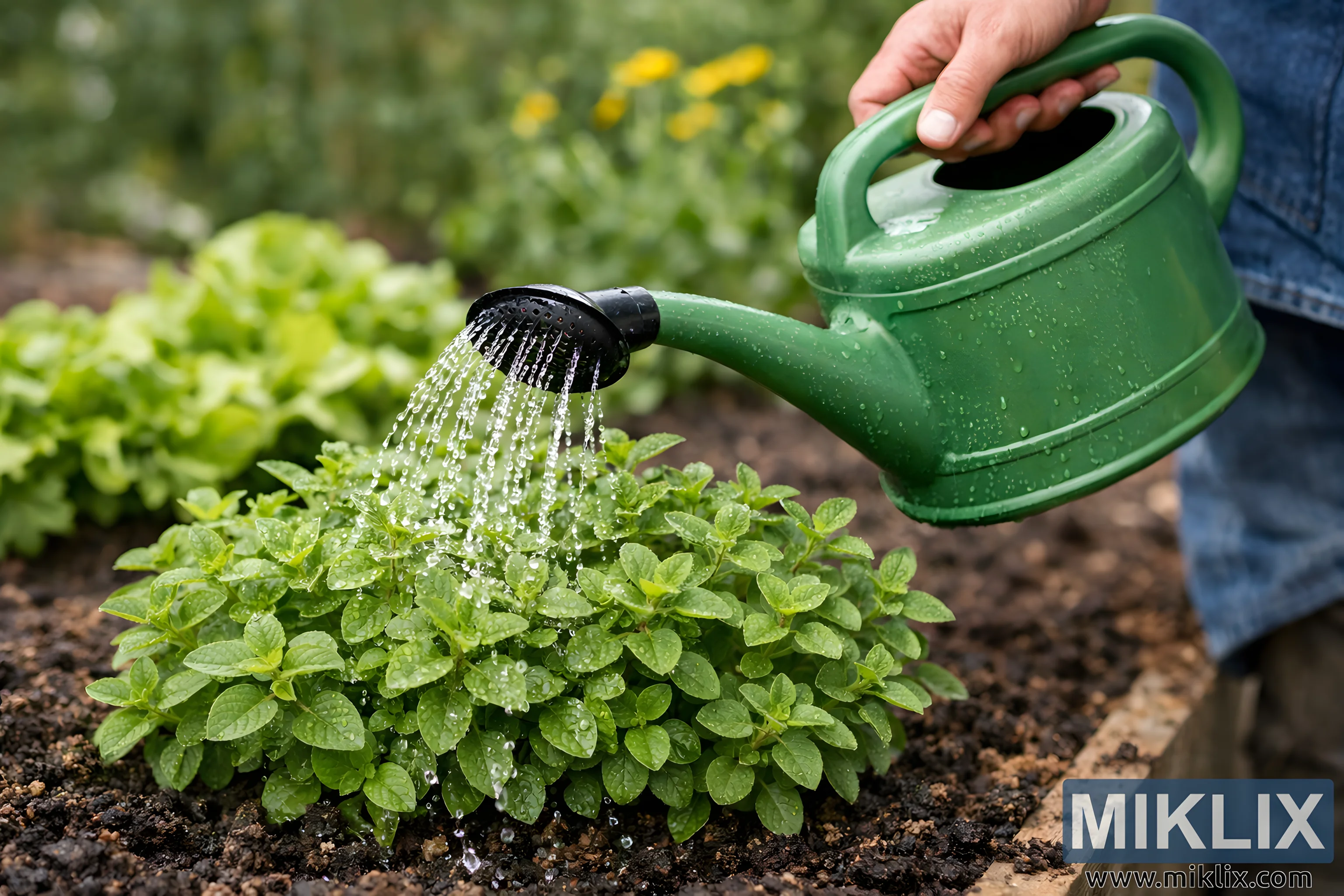 Close-up photo of a gardener hand watering a lush oregano plant using proper technique, showing gentle water flow, healthy green leaves, and a raised garden bed in natural daylight
