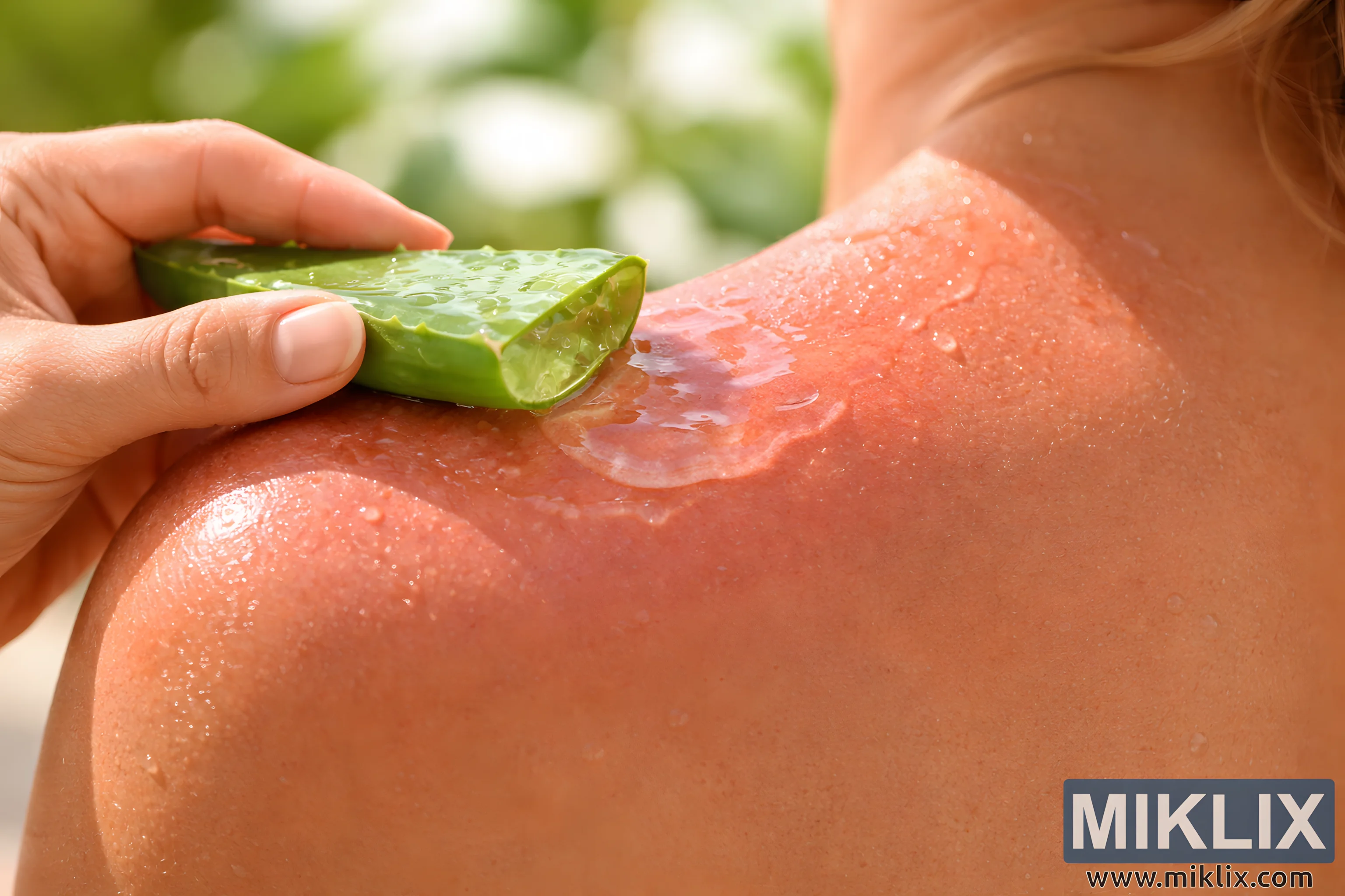 High-resolution close-up showing fresh aloe vera gel being gently applied to sunburned skin, highlighting natural after-sun care, cooling relief, and plant-based skincare.