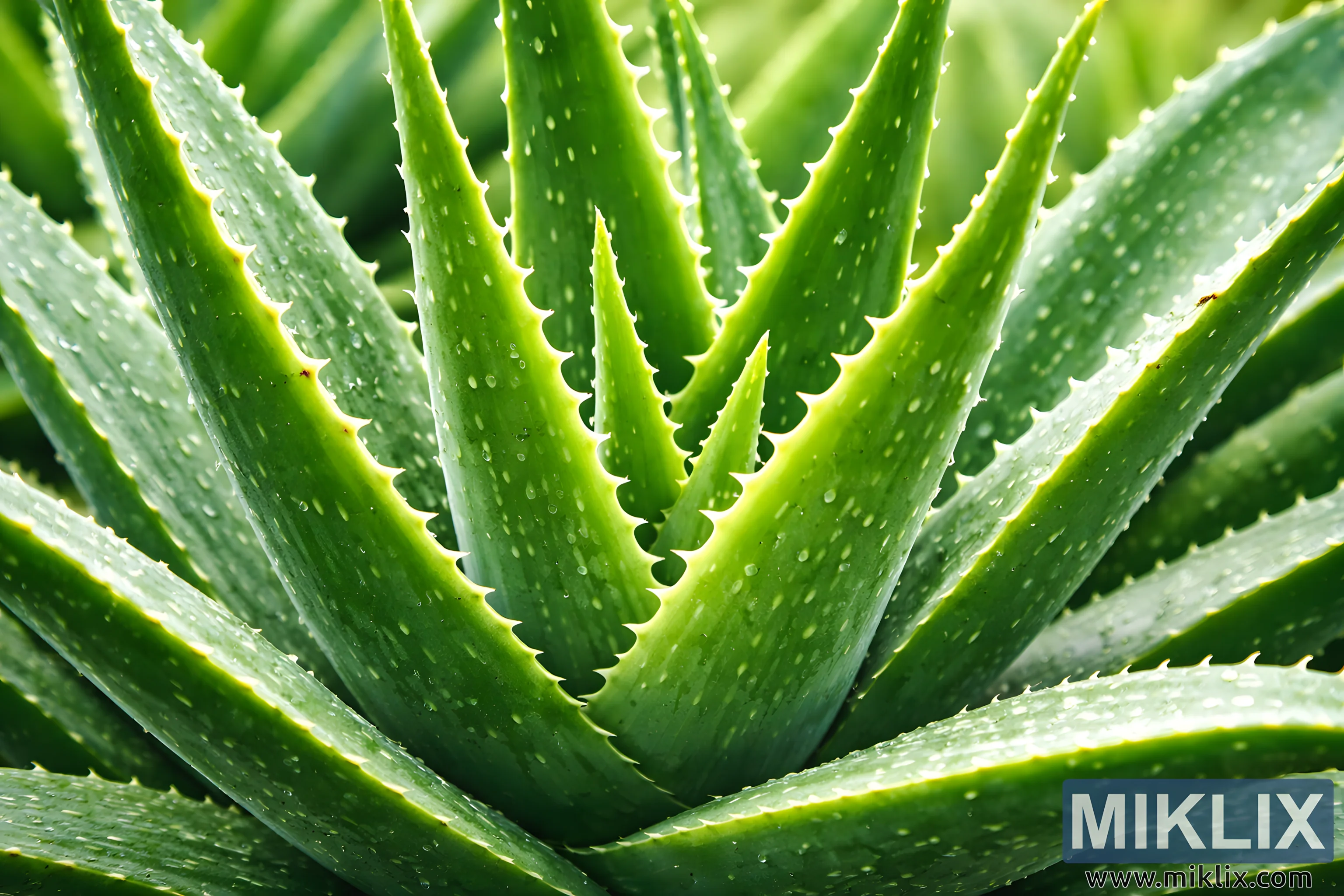 The image presents a highly detailed, high-resolution close-up view of a healthy Aloe vera plant (Aloe barbadensis miller) captured in landscape orientation. The composition centers on a dense rosette of thick, fleshy leaves radiating outward from the core of the plant. Each leaf is elongated, tapering gradually to a pointed tip, and displays the characteristic succulent structure associated with Aloe vera. The surfaces of the leaves are a rich, vibrant green, transitioning subtly from deeper emerald tones near the base to slightly lighter, fresher hues toward the edges and tips. Fine serrations line both margins of every leaf, forming small, evenly spaced, pale teeth that create a rhythmic pattern along the contours and emphasize the plant’s natural symmetry. Numerous tiny water droplets cling to the leaf surfaces, catching the light and adding a sense of freshness, vitality, and early-morning moisture, as if the plant has just been misted or exposed to dew. The droplets enhance the texture, making the waxy, gel-filled skin appear cool and alive. The lighting is bright yet soft, highlighting the smooth curvature and thickness of the leaves without harsh shadows, and revealing subtle speckling and natural imperfections typical of a real Aloe vera plant. The shallow depth of field gently blurs the background foliage, which appears as layered green shapes and soft gradients, ensuring that attention remains focused on the central plant. Overall, the image conveys botanical clarity, natural health, and organic beauty, making it suitable for educational, medicinal, cosmetic, or wellness-related contexts where Aloe vera is associated with healing, hydration, and purity.