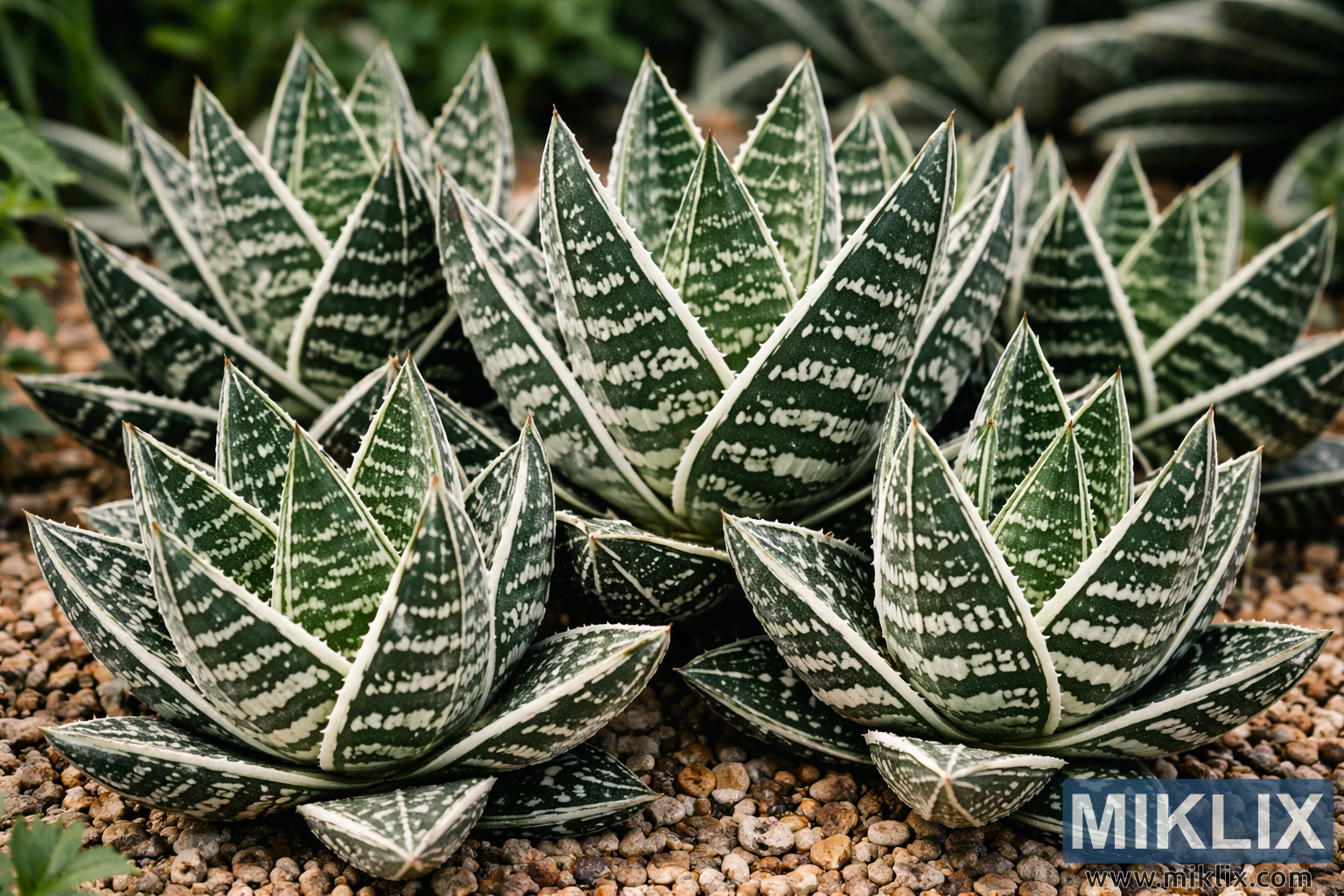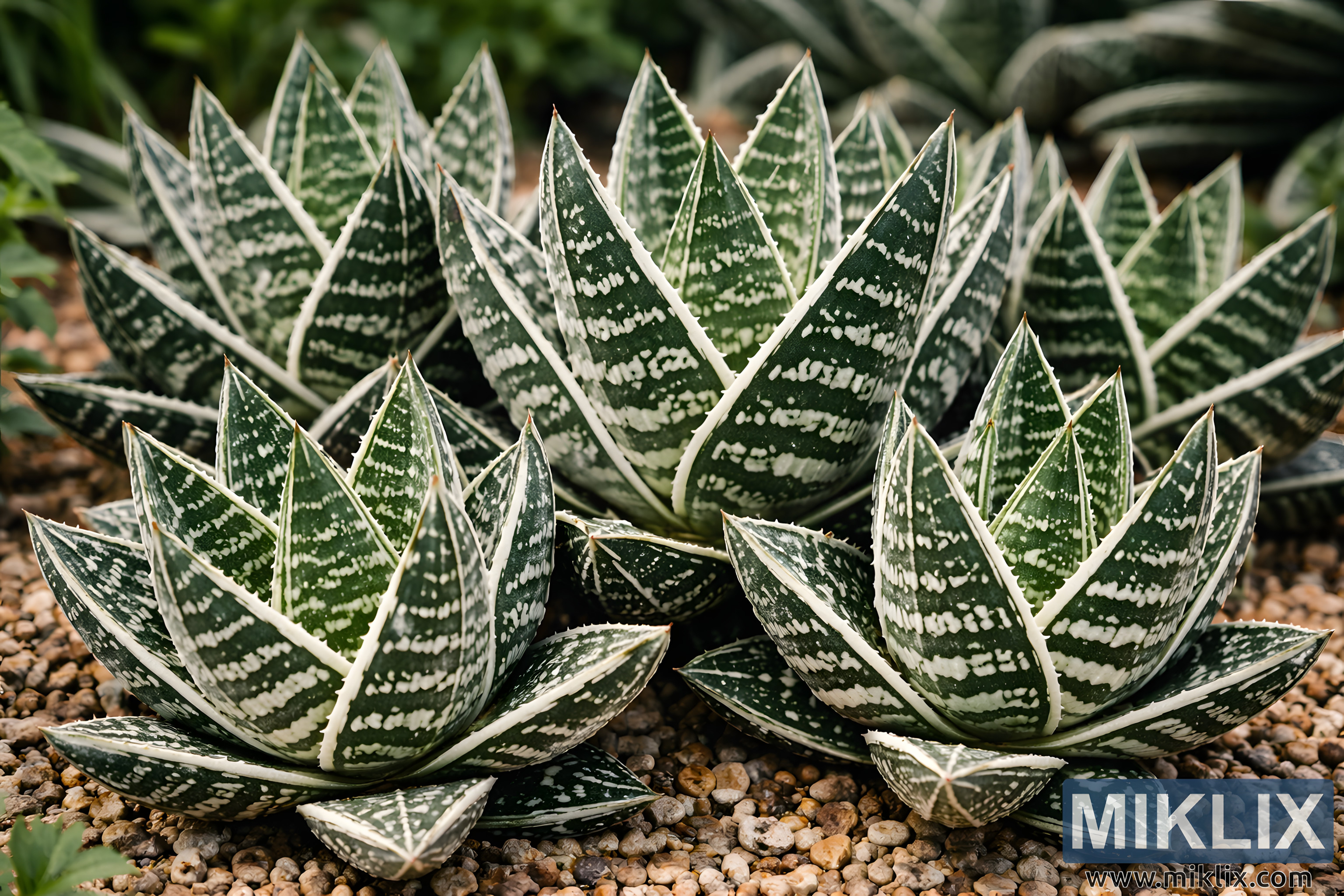 The image presents a highly detailed, landscape-oriented photograph of a cluster of Tiger Aloe plants (Aloe variegata) growing closely together in a naturalistic setting. The composition centers on several mature rosettes arranged in the foreground, each displaying thick, triangular, fleshy leaves that radiate outward in a symmetrical, star-like pattern. The leaves are deep green in color and marked with distinctive, irregular white horizontal bands and speckles that create the characteristic "tiger" striping from which the plant derives its common name. These markings vary subtly from leaf to leaf, giving the cluster a dynamic, organic texture rather than a uniform appearance. Along the edges of the leaves, fine white serrations catch the light, emphasizing the sharp geometry and sculptural quality of the plant. The leaf tips taper to gentle points, some showing faint hints of brown or cream at the very ends, suggesting natural growth and exposure rather than artificial perfection. The aloes are rooted in a bed of small, rounded pebbles in shades of tan, brown, and muted gray, which provide a warm, earthy contrast to the cool greens of the foliage. The pebbles are rendered with crisp detail in the foreground, while the background gradually softens into a gentle blur, indicating a shallow depth of field. In the out-of-focus background, additional succulent forms and greenery are visible, reinforcing the impression of a garden or botanical setting without distracting from the primary subject. Lighting appears natural and diffuse, likely daylight, highlighting the waxy surface of the leaves and enhancing the contrast between the white striping and the green leaf tissue. Overall, the image conveys a sense of calm, order, and resilience, celebrating the geometric beauty and distinctive patterning of Tiger Aloe in a way that feels both botanical and artistic.