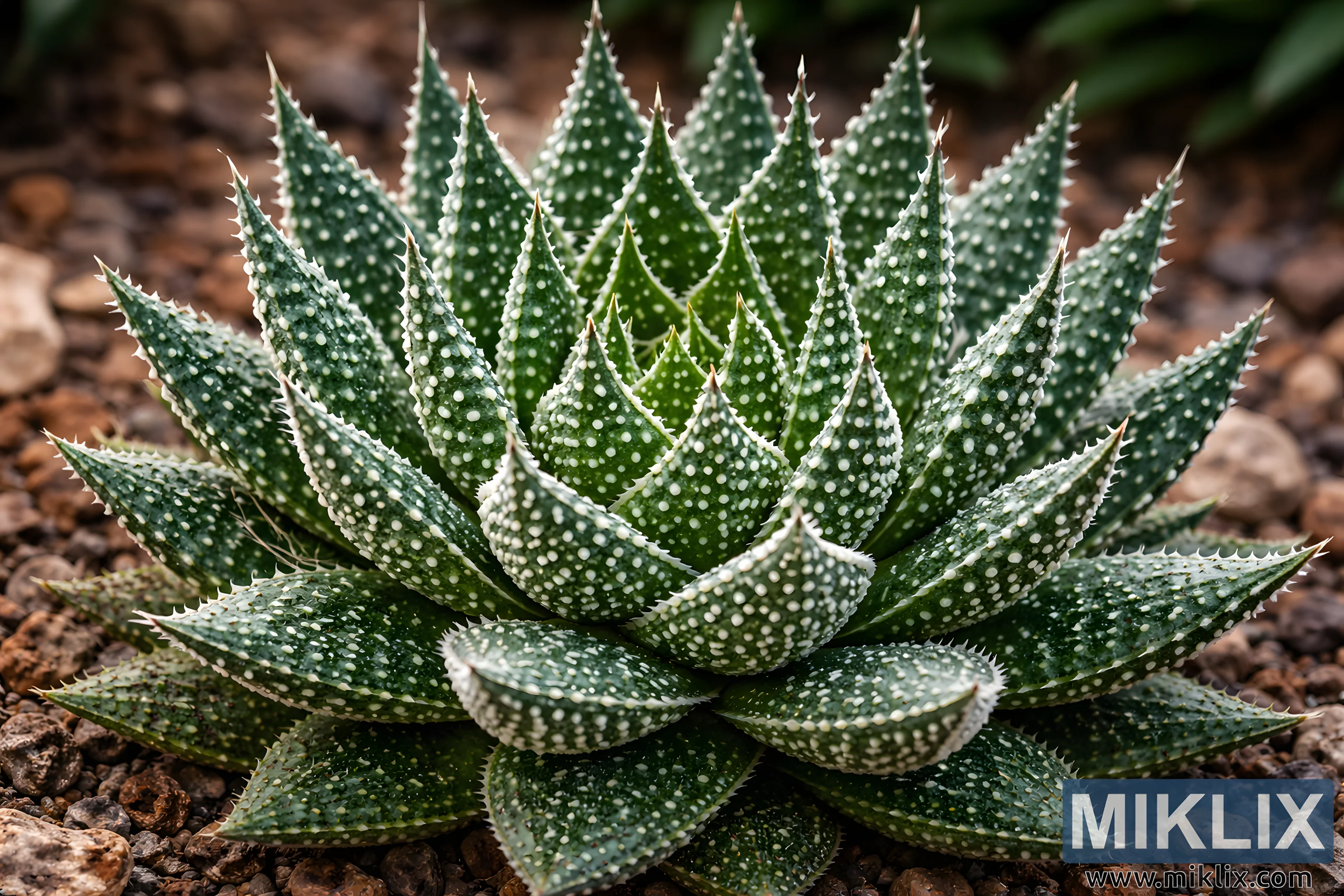 Overall, the image conveys a sense of botanical precision and calm, celebrating the geometric beauty and natural resilience of a succulent adapted to arid conditions. The composition, sharp focus, and high resolution allow viewers to appreciate fine surface details such as the leaf texture, spotting, and subtle color variations, making the photograph suitable for educational, horticultural, or decorative use.
