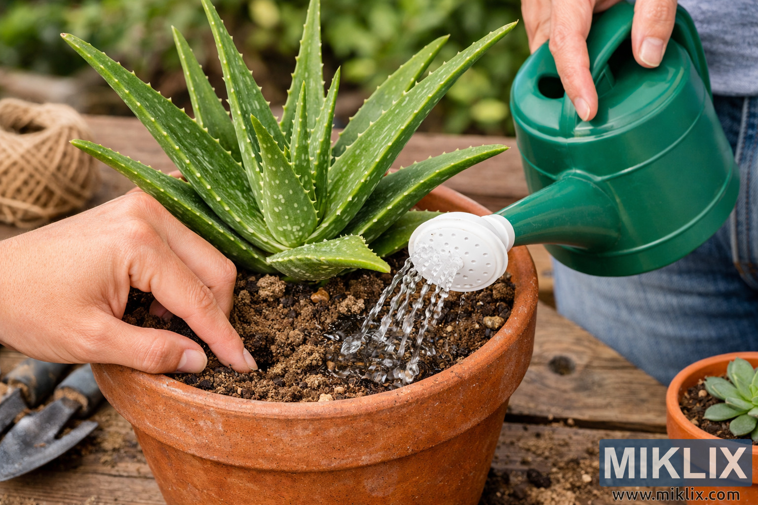 Educational photo demonstrating correct aloe vera watering by testing dry soil with a finger before gently watering the plant.