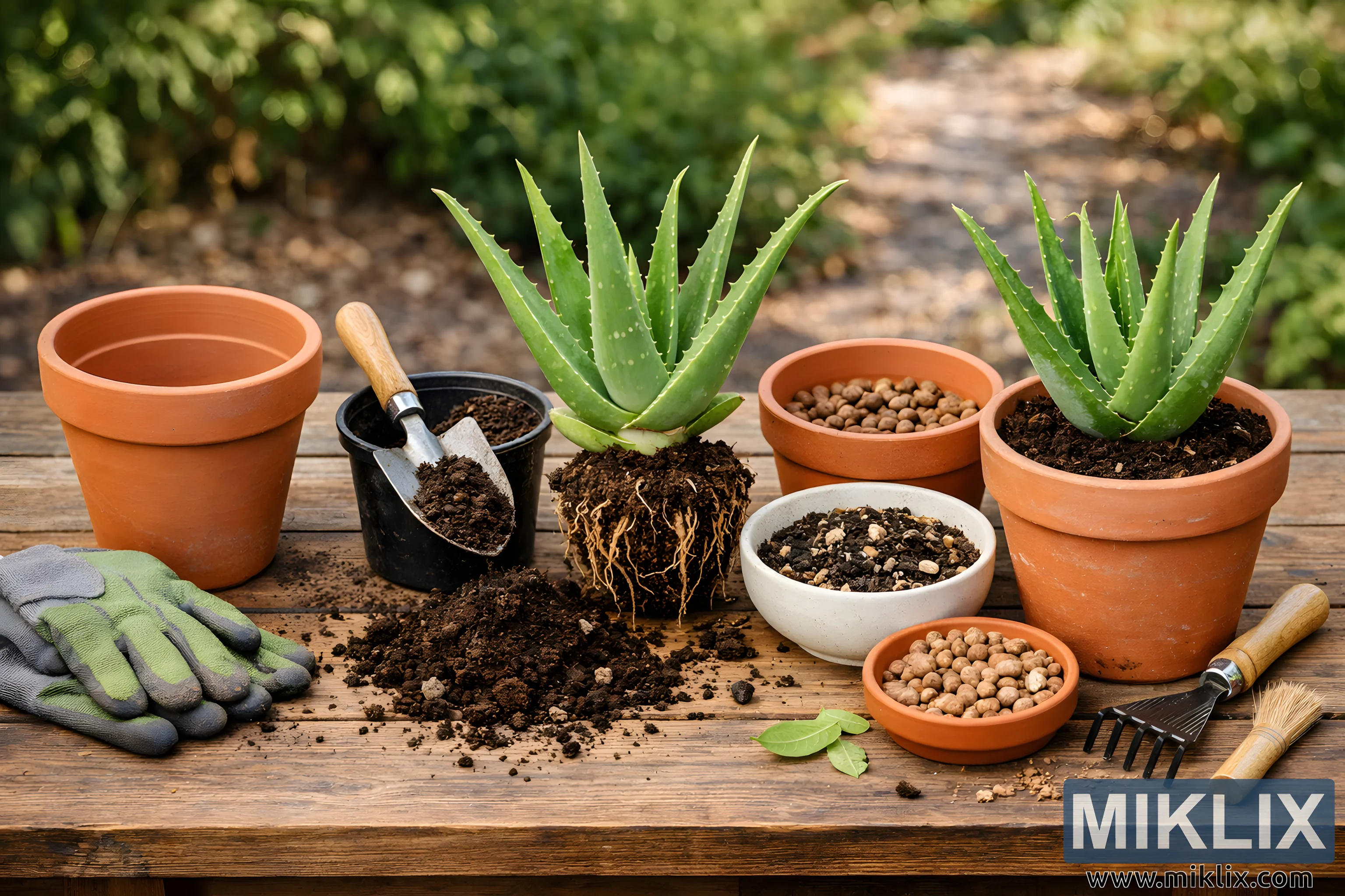 A detailed, natural-light photograph illustrating the step-by-step process of repotting an aloe vera plant, including tools, soil, drainage materials, and the plant before and after being placed in a new terracotta pot.