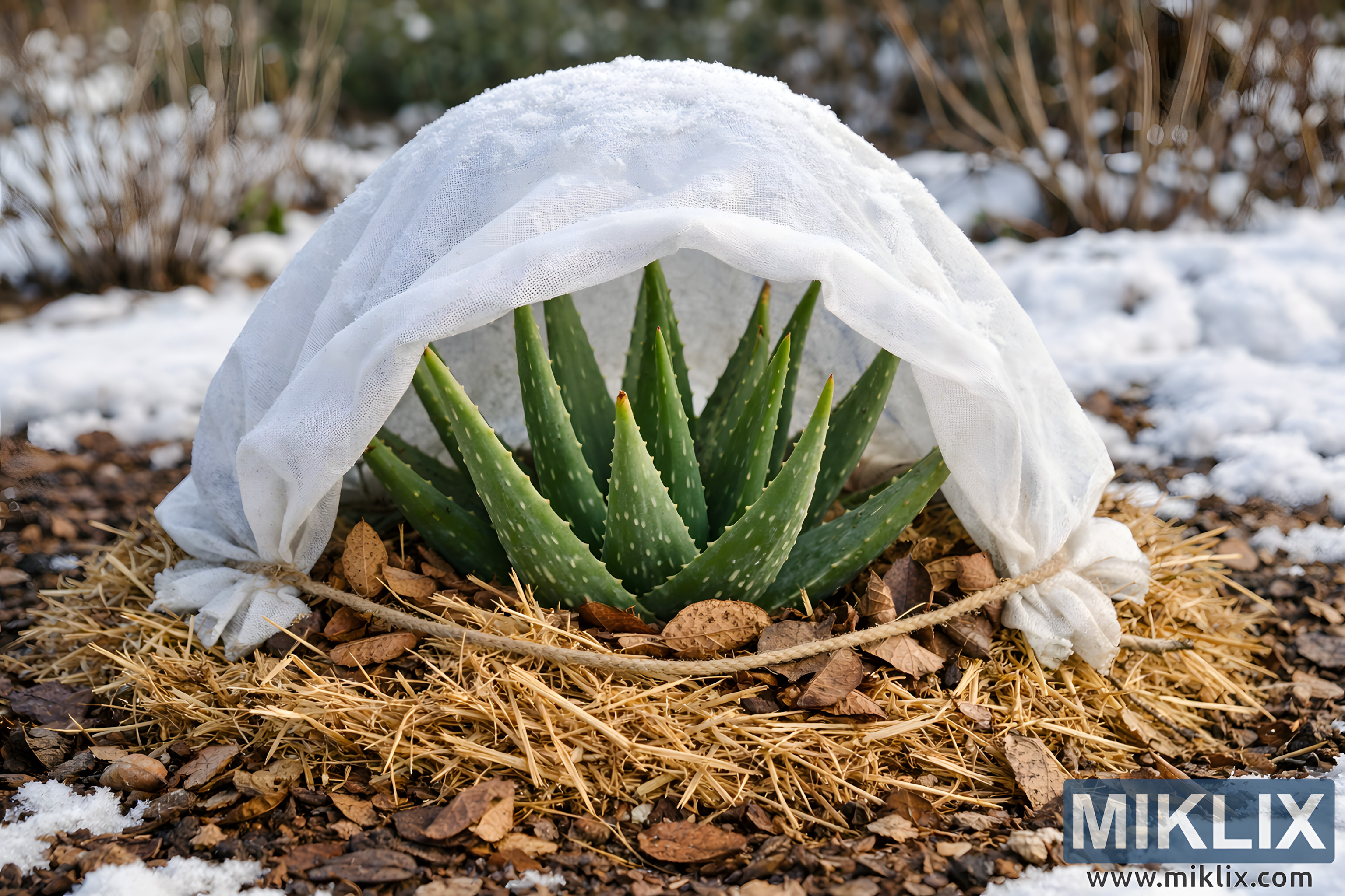 Photo of an aloe vera plant protected for winter with straw mulch and a white frost cover in a snowy garden setting.